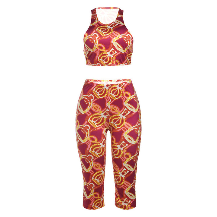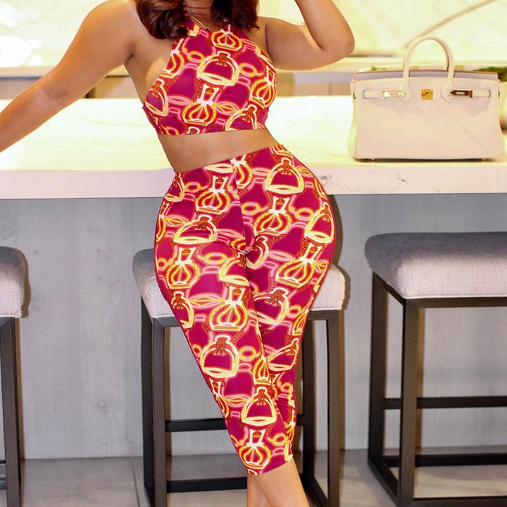 European and American style 2025 summer new women's clothing sexy spice girl navel tight contrasting color personalized printed nine-point pants set