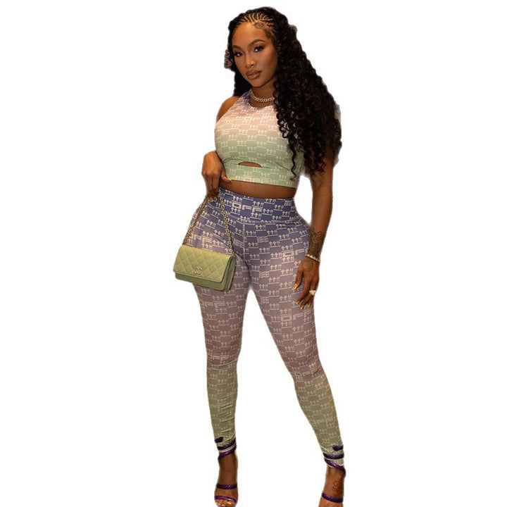 European and American style casual fashion women's clothing slim-fit sports printed pants set, street vest and pants two-piece set