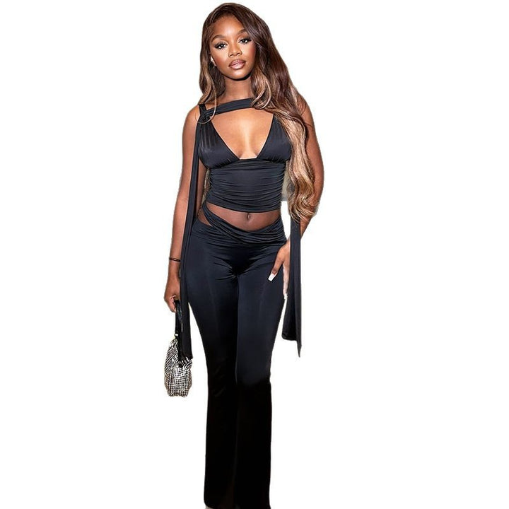 European and American style casual sports women's clothing exposed navel sexy solid color pants set V-neck top slim trousers set