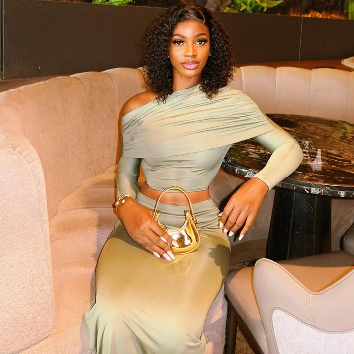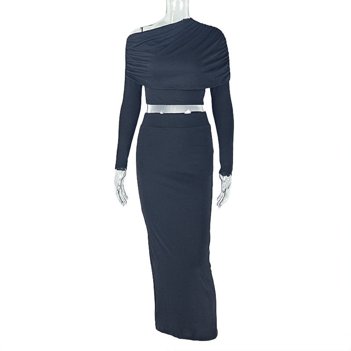 European and American style fashion exposed navel solid color pleated skirt set single shoulder oblique collar long sleeve two-piece set temperame...