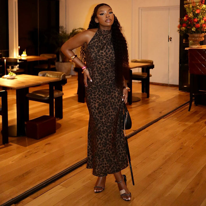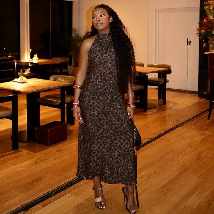 European and American style fashion printed women's clothing comfortable leopard print personalized pencil skirt high neck sleeveless waist long d...