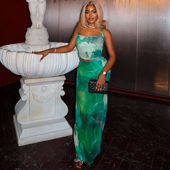 European and American style fashion sexy skirt set hip-wrapped color matching suspender long skirt two-piece set fresh backless women's clothing t...