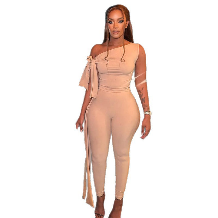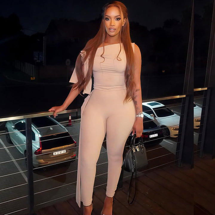 European and American style fashion solid color pleated pants set diagonal collar top leggings two-piece set niche design women's clothing