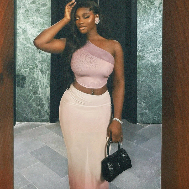 European and American style, fresh and fashionable women's clothing, open-button buttocks, tight body, gradual change color skirt set, oblique coll...