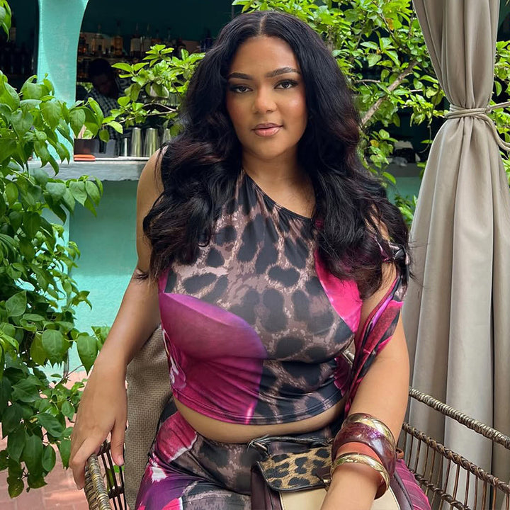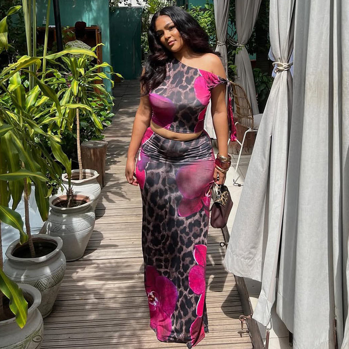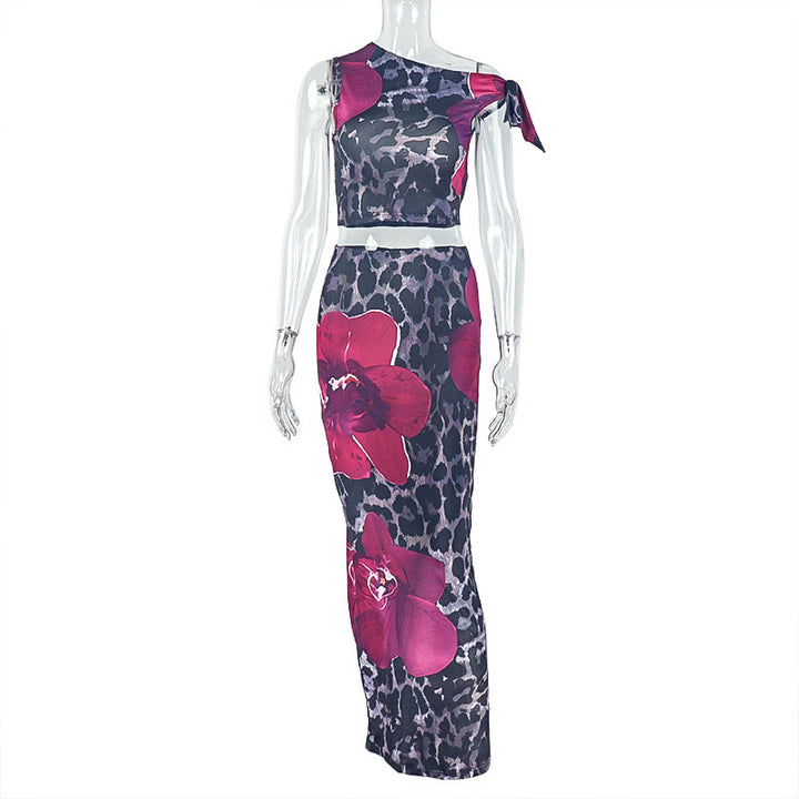 European and American style hip wrap temperament pleated printed slim skirt set single shoulder two-piece set splicing leopard print women's cloth...