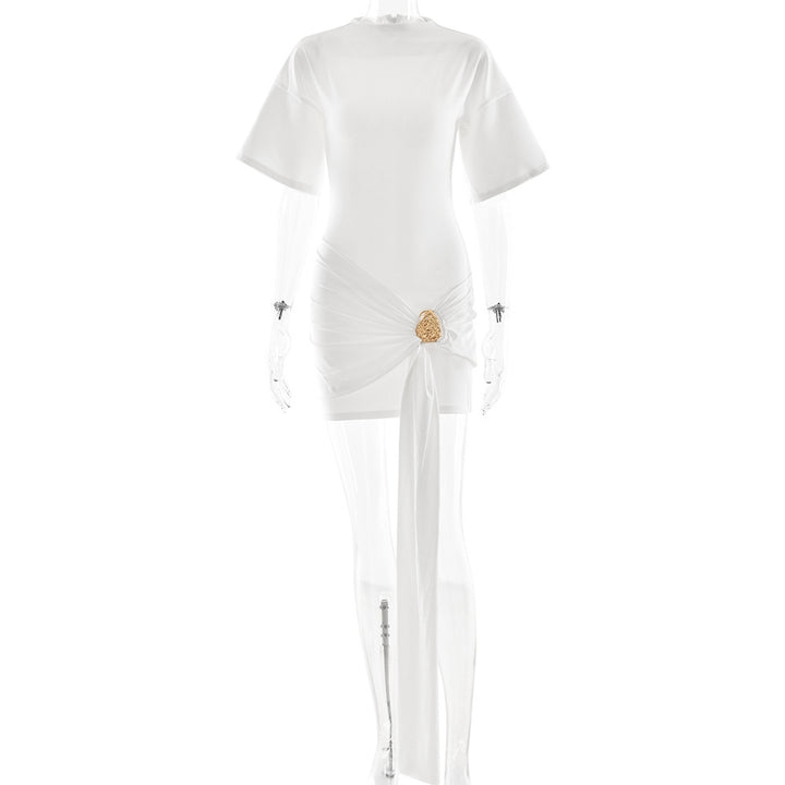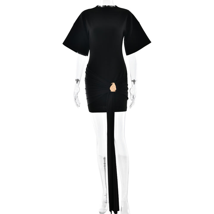 European and American style hot-selling new products solid color round neck hip skirt sexy waist half-sleeve streamer pleated dress