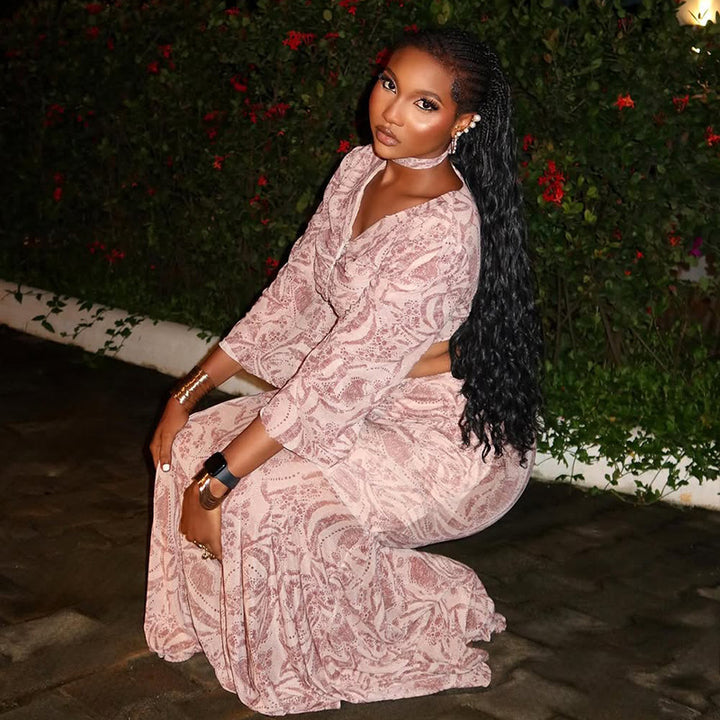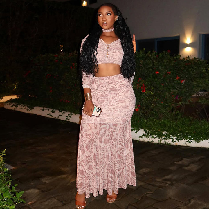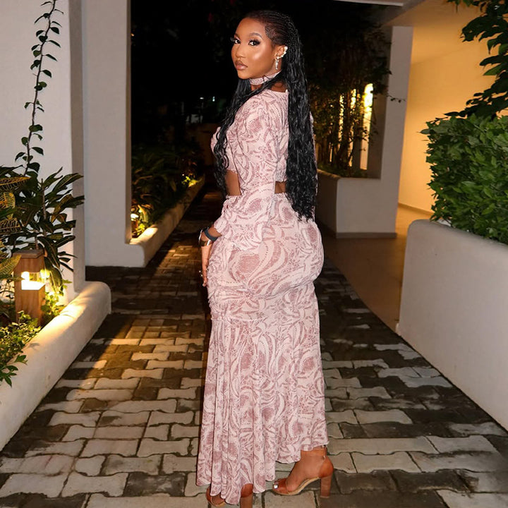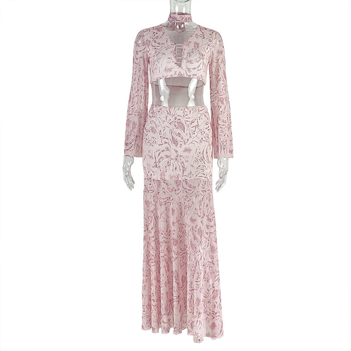 European and American style ins printing hip-wrapped slim-fitting pleated skirt set long-sleeved V-neck two-piece set elegant temperament women's ...
