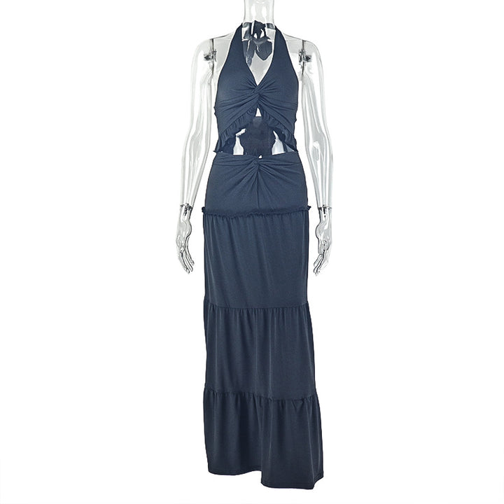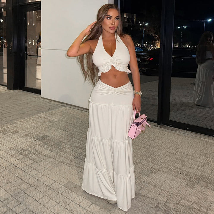 European and American style ins solid color fashionable and sexy pleated skirt set hanging neck, open button, chest wrapping V-neck two-piece wome...