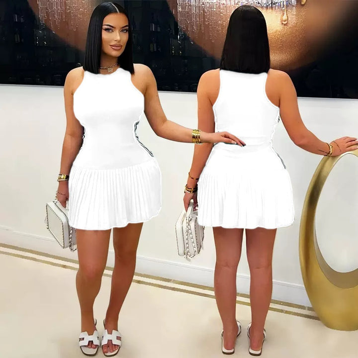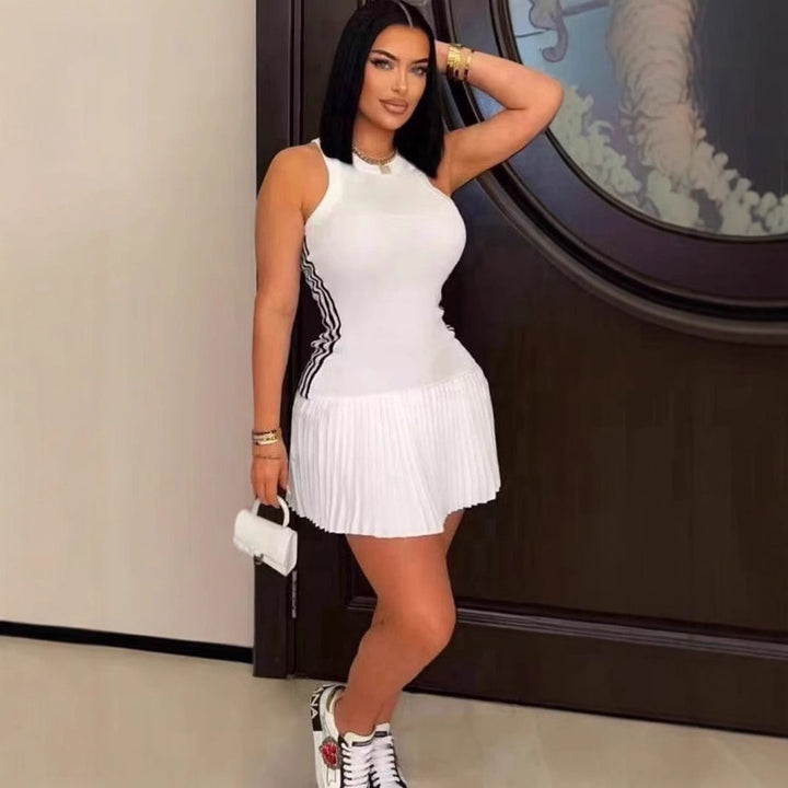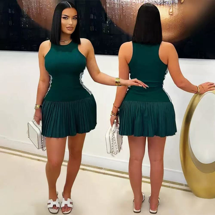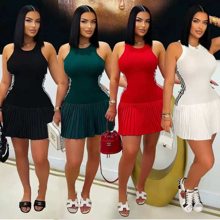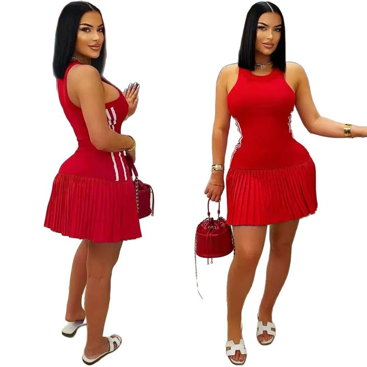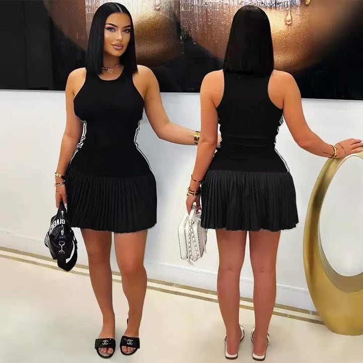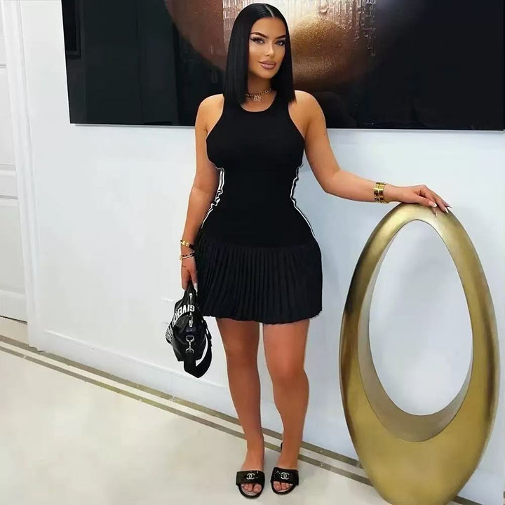 European and American style ins Spice Girls sleeveless slim-fitting knitted dress side striped pleated skirt sexy hip-wrapped and thin women's clot...