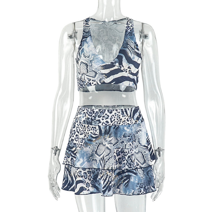 European and American style ins summer vacation printing fashion skirt set V-neck navel skirt two-piece women's clothing trend