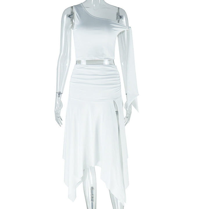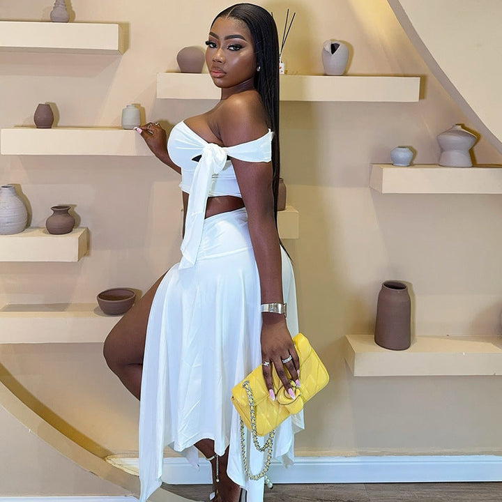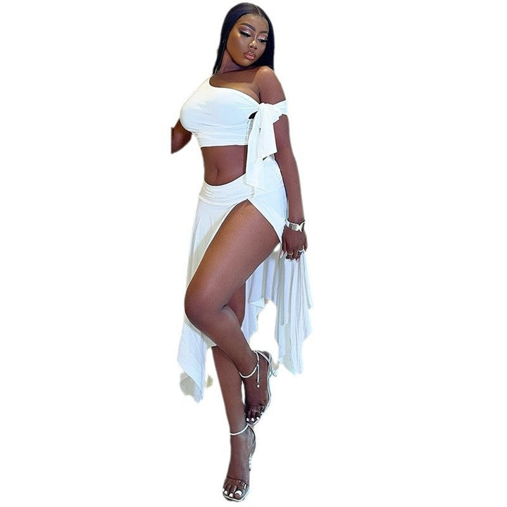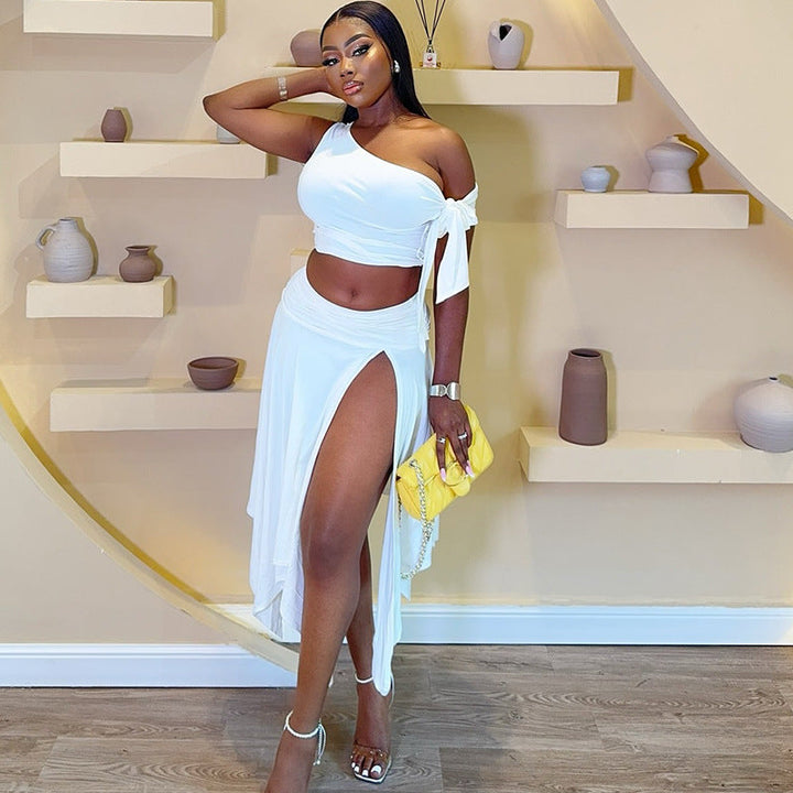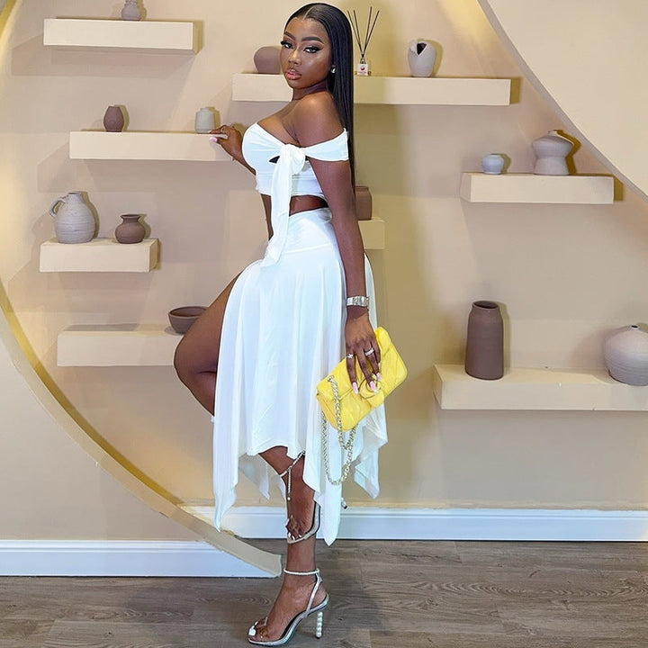 European and American style ins women's skirt set, sexy sleeveless shoulder top, streamer half-body split skirt, two-piece suits.