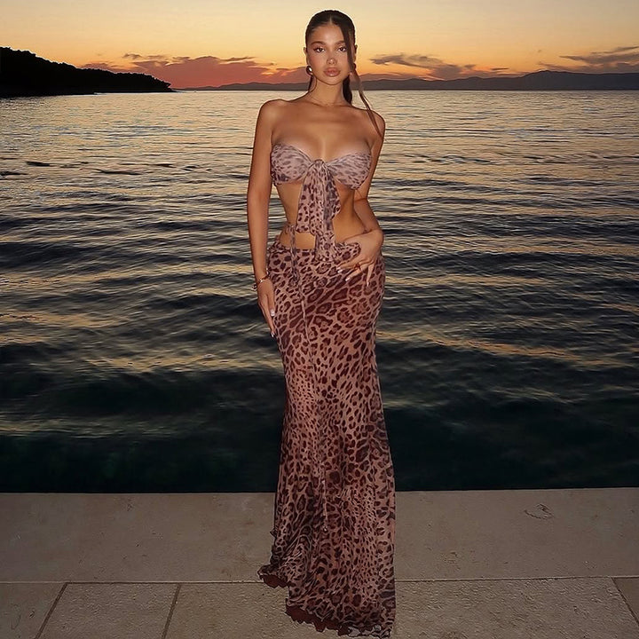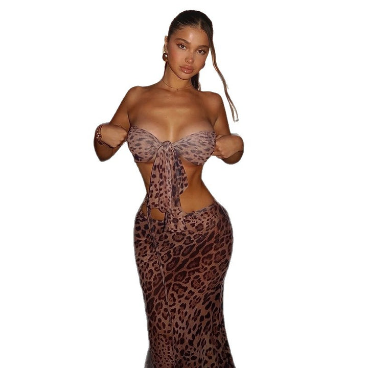 European and American style leopard print casual seaside skirt set chest wrap slightly transparent holiday lace-up two-piece women's clothing tide