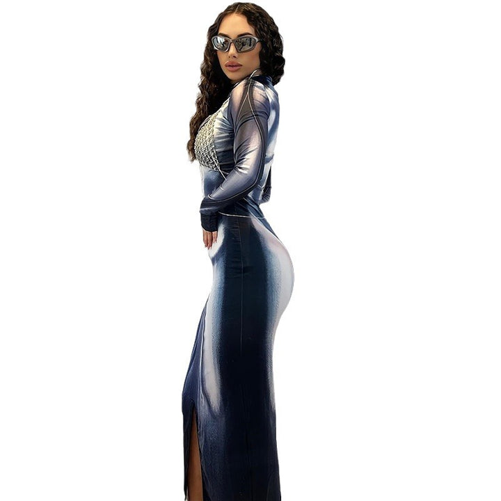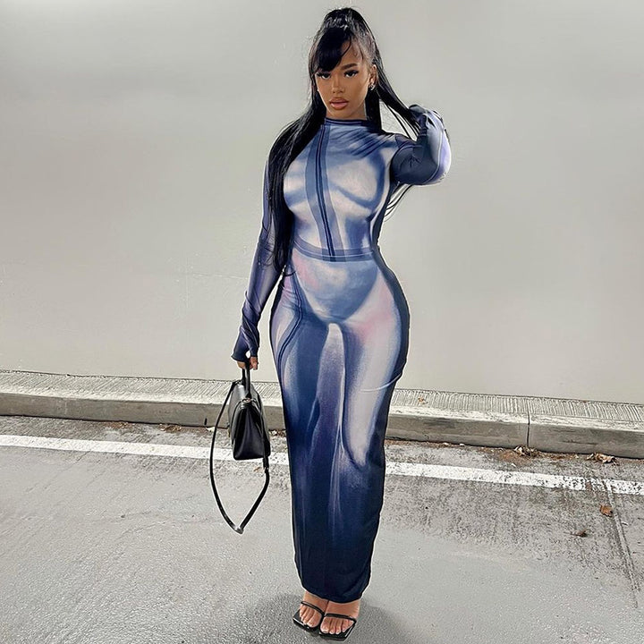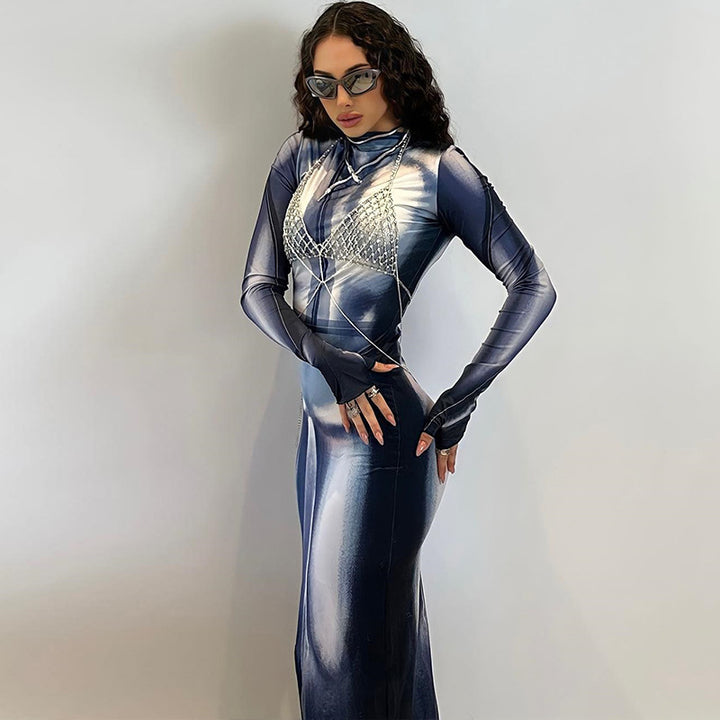 European and American style new slim-fitting long-sleeved gloved pencil skirt fashion printing stand-up collar long pullover dress wholesale
