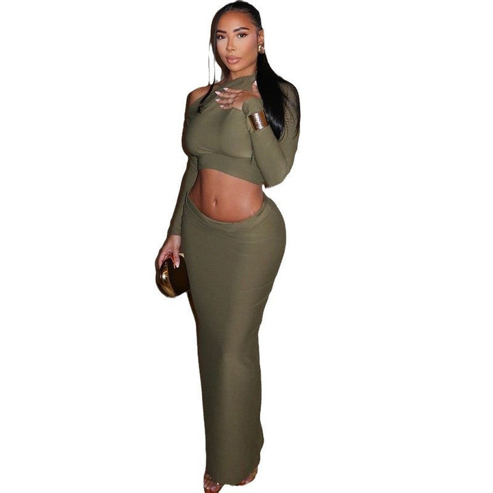 European and American style new women's clothing comfortable and casual solid color open-navel long skirt set long skirt long sleeve diagonal coll...
