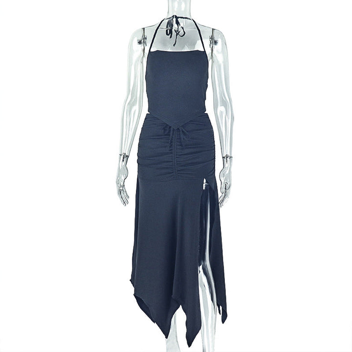 European and American style pleated swinging collar solid color temperament skirt set strap hanging neck personalized split two-piece set women's ...