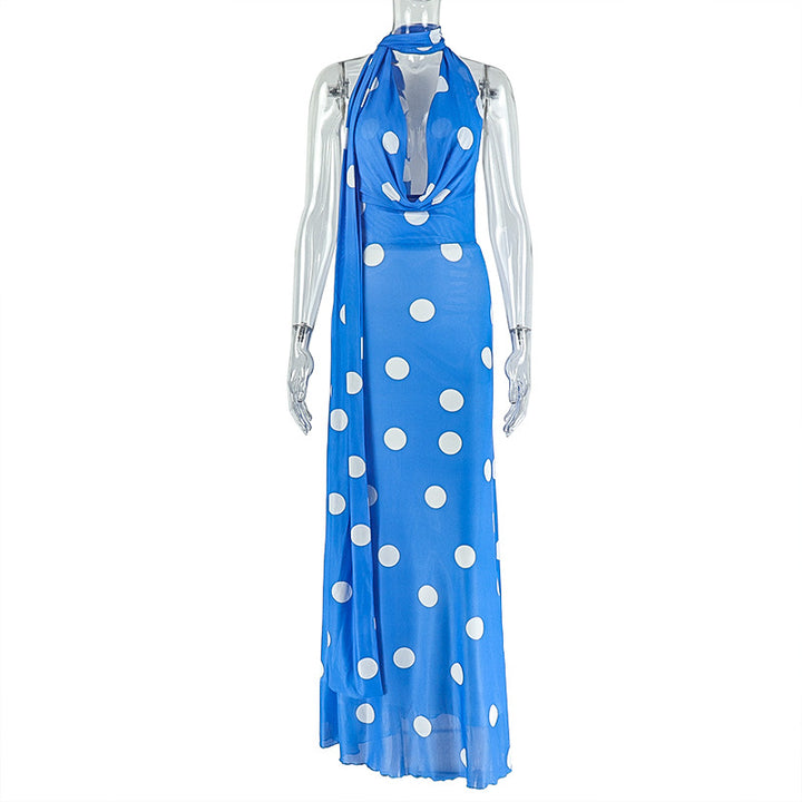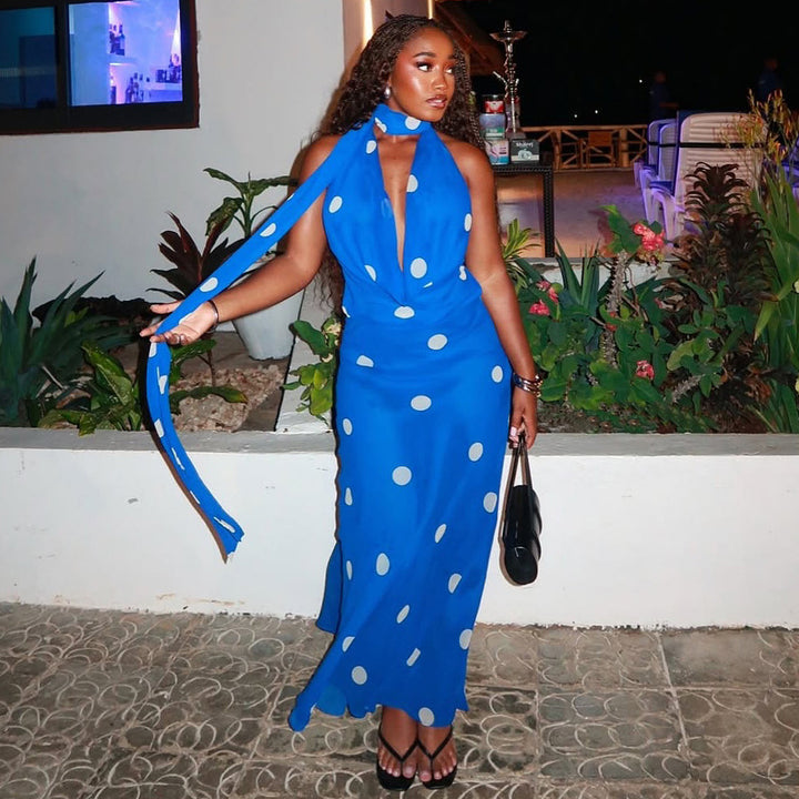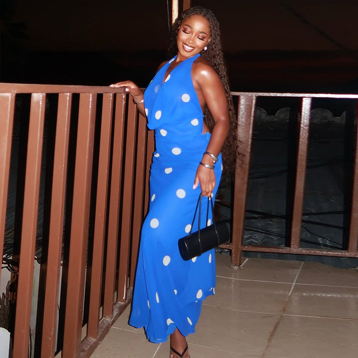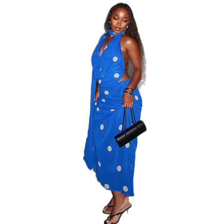 European and American style polka dot slim-fit hip-wrapped pleated skirt set swinging collar hanging neck backless two-piece set sexy women's clot...