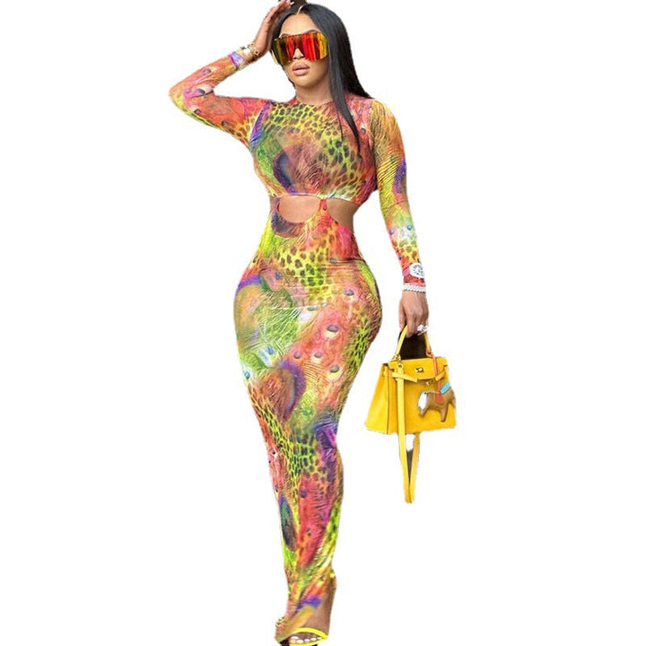 European and American style round neck tight long dress phoenix tail printing long sleeve hip wrap pencil skirt street hipster skirt women