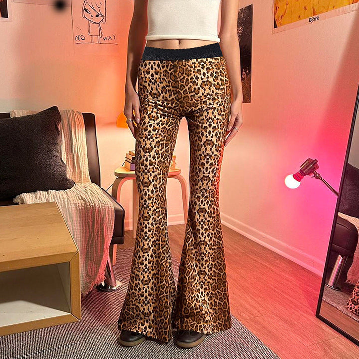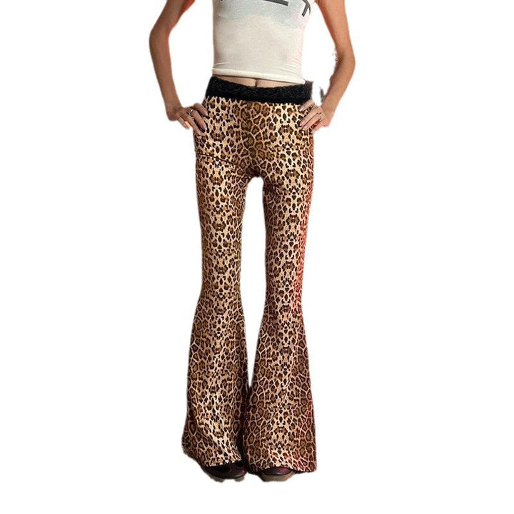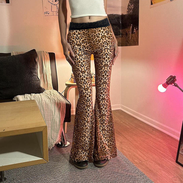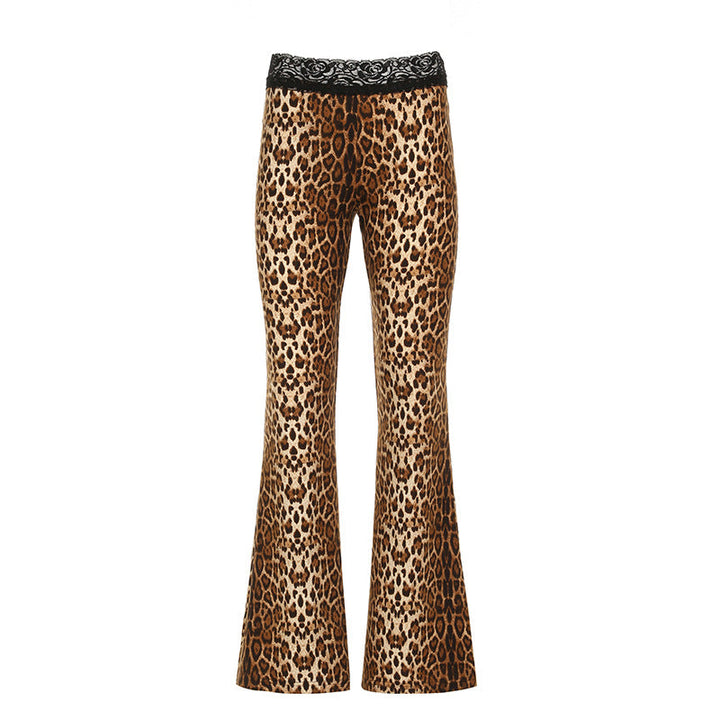 European and American style sexy leopard print basic flared pants tight fashion casual trousers printed lace waist flared pants
