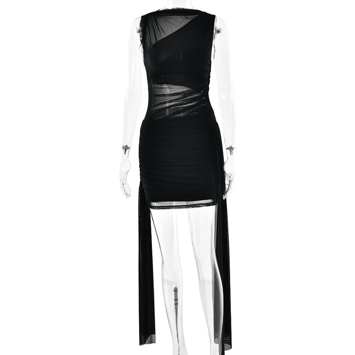 black, purple, Using mesh yarn + milk silk fabric, gradual change of folds and hip wrapping design |