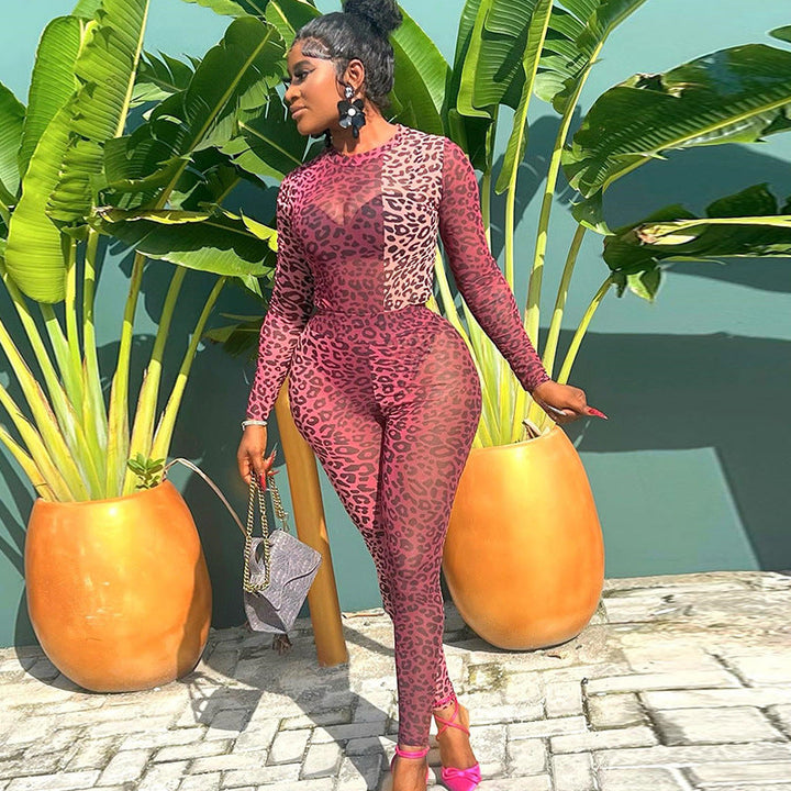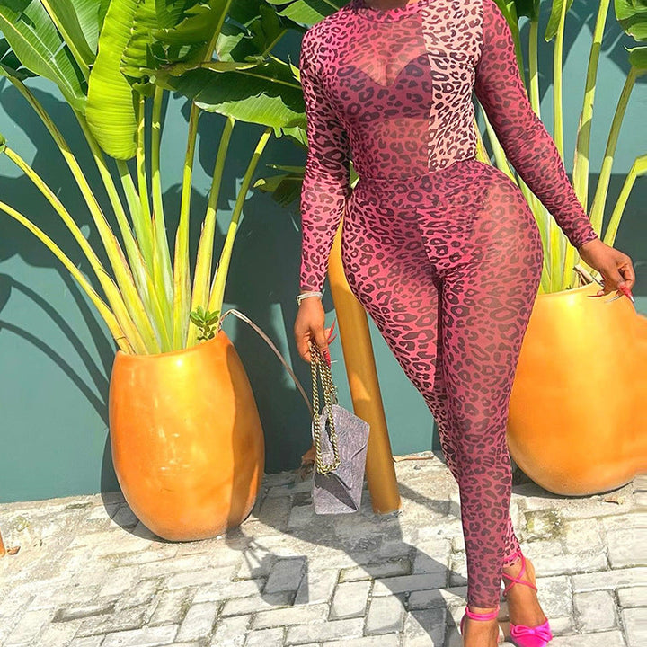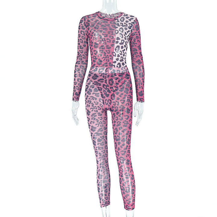 European and American style sexy slightly transparent pants set round neck tight trousers elastic two-piece set fashionable leopard print women's ...