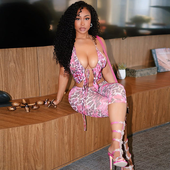 European and American style sexy sweet women's clothing leopard print fashion pants set strap-up halter top leggings two-piece set