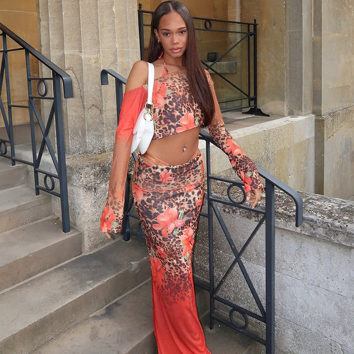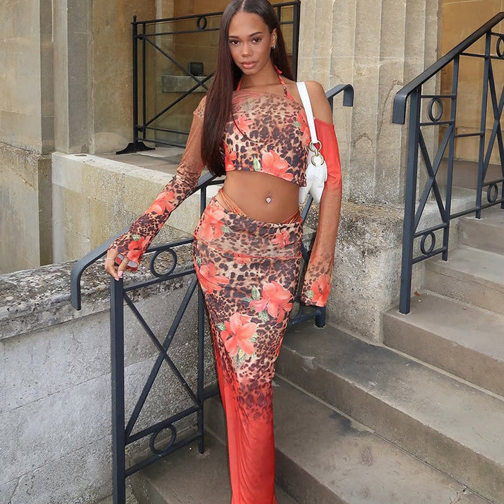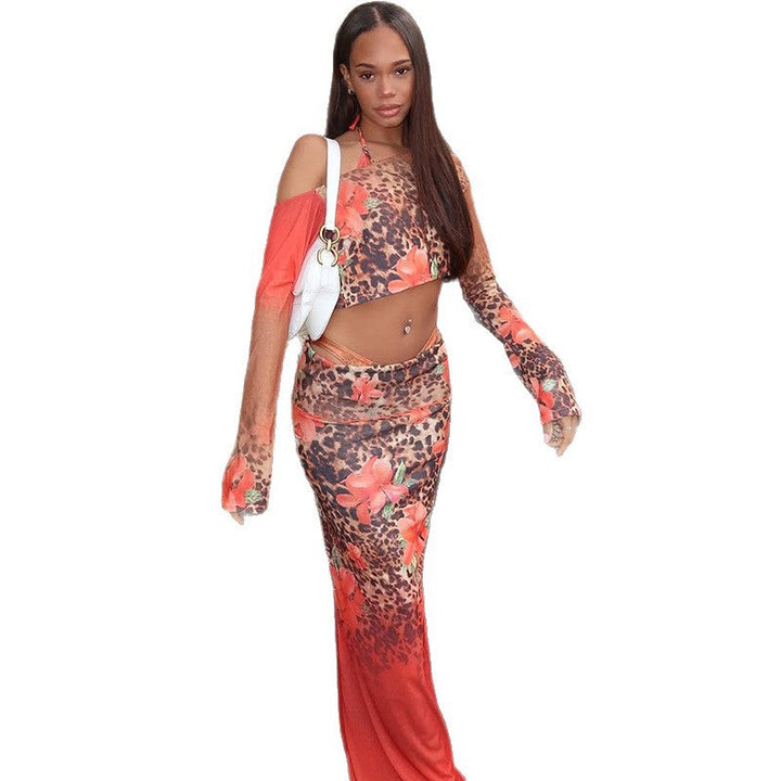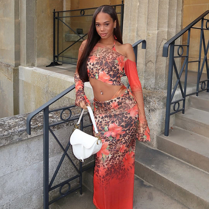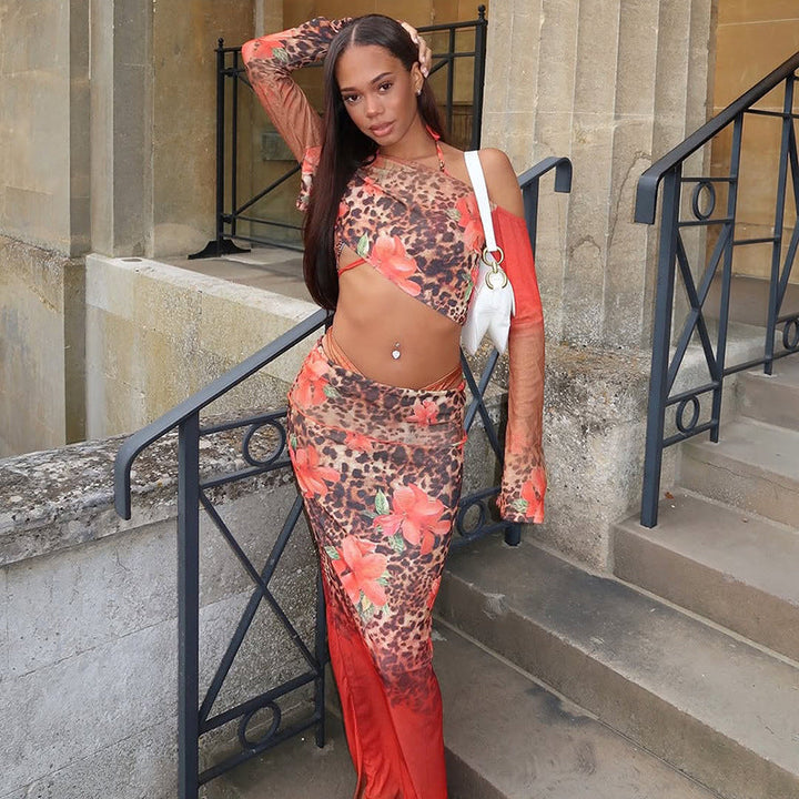 European and American style slim-fit hip-wrapped diagonal neck open-button skirt set, one shoulder long-sleeved two-piece set, sexy printed women'...