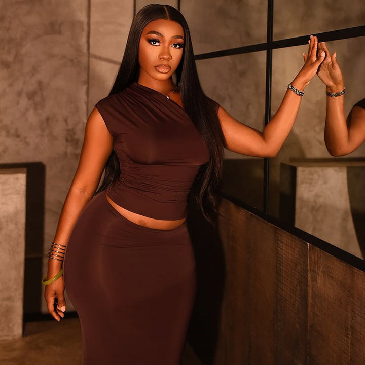 European and American style slim fit pleated fashion solid color skirt set diagonal collar hip wrap one-step skirt two-piece women's clothing