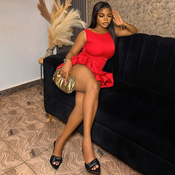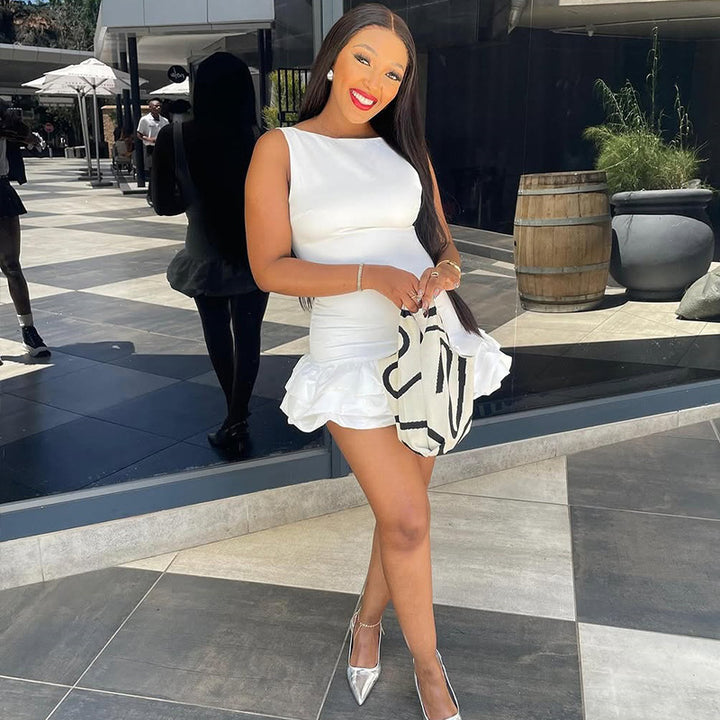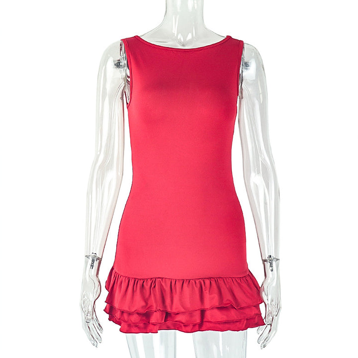 European and American style solid color women's clothing slim star sexy and thin pleated skirt round neck solid color casual short dress tide
