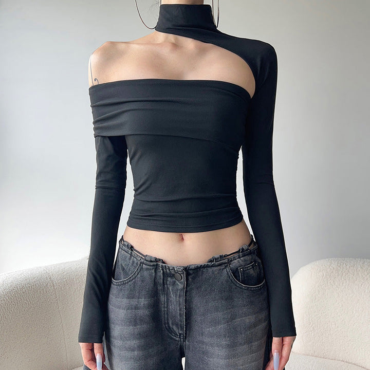 European and American style Spice Girl hanging neck asymmetrical long-sleeved off-the-shoulder flanged tube top fashion street personality casual T...