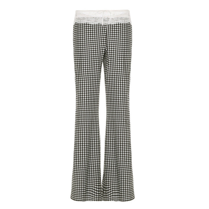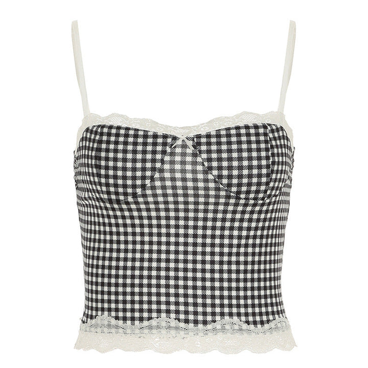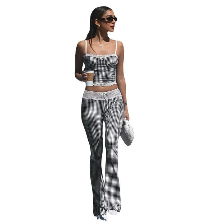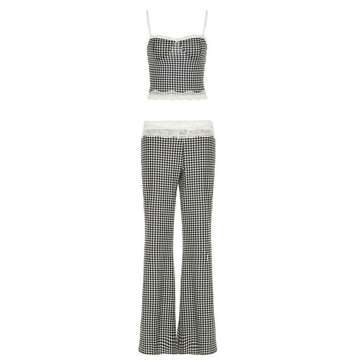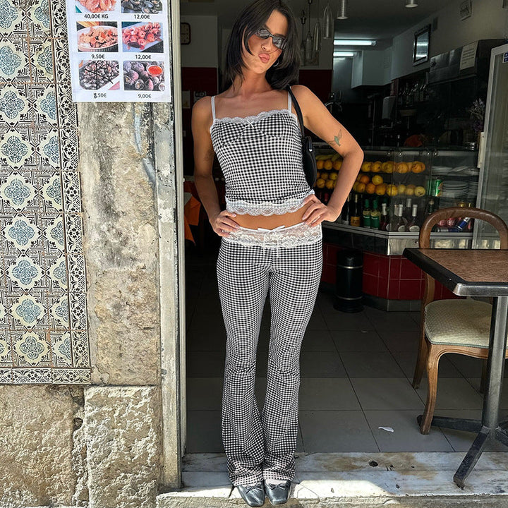 European and American style spring and summer women's clothing plaid splicing lace suspender bell pants set fashion street two-piece set