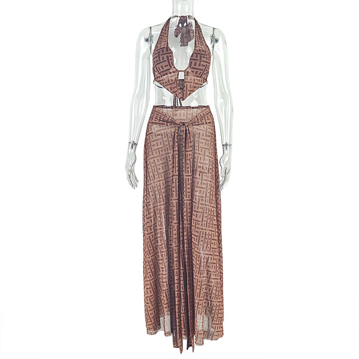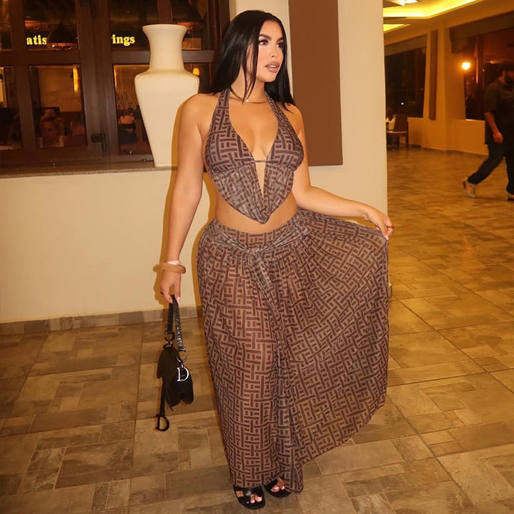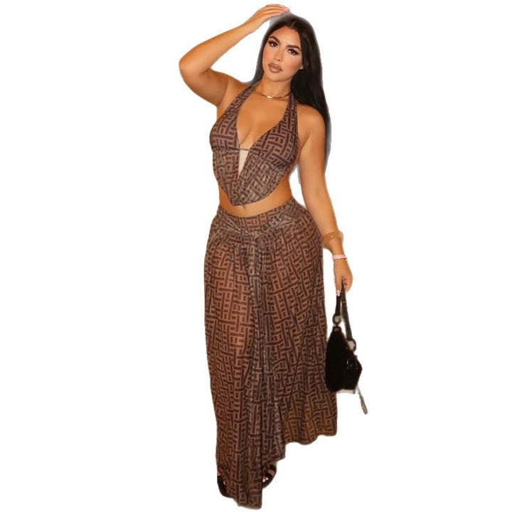 European and American style summer sexy micro-transparent printing skirt set swinging collar pleated neck exposed navel two-piece women's clothing...
