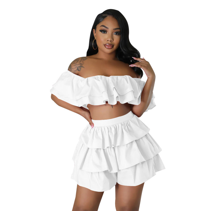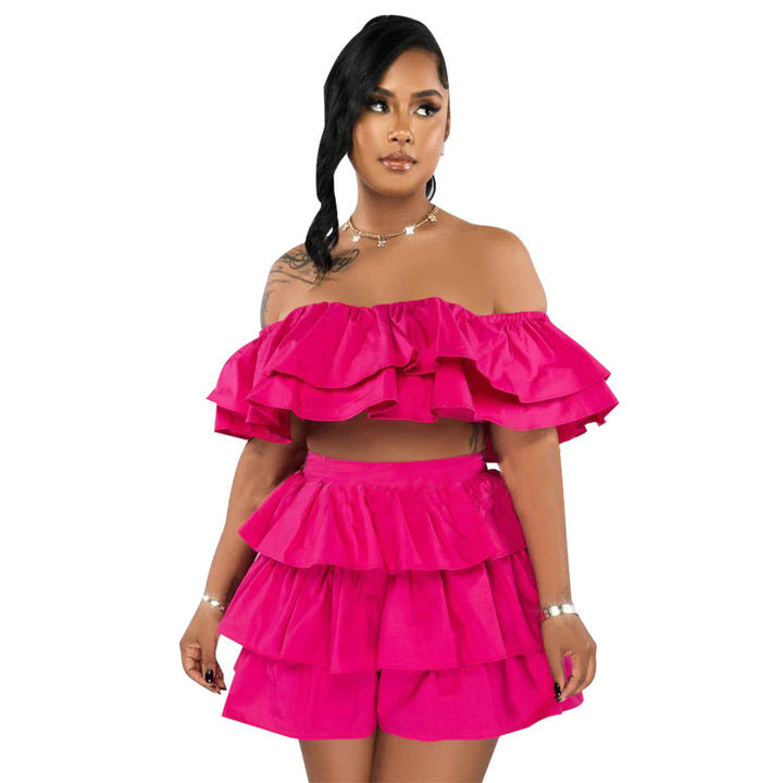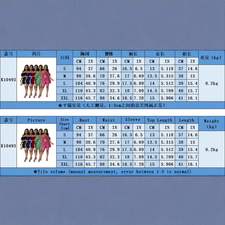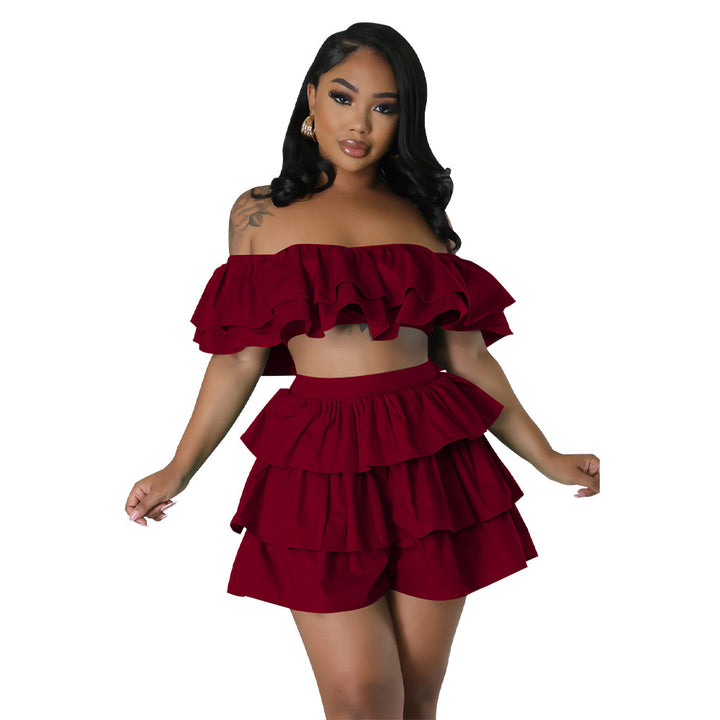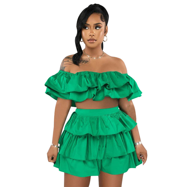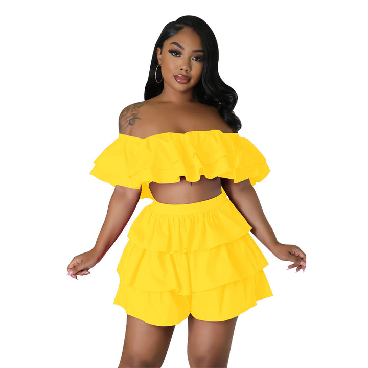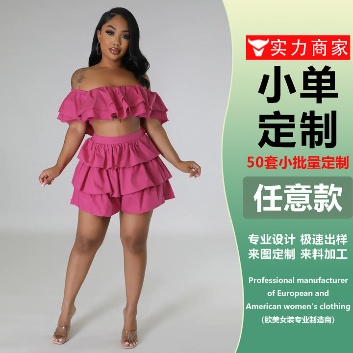 European and American style women's clothing is popular, with added color ruffle leaf edge off-the-shoulder collar skirt set, spot processing with ...