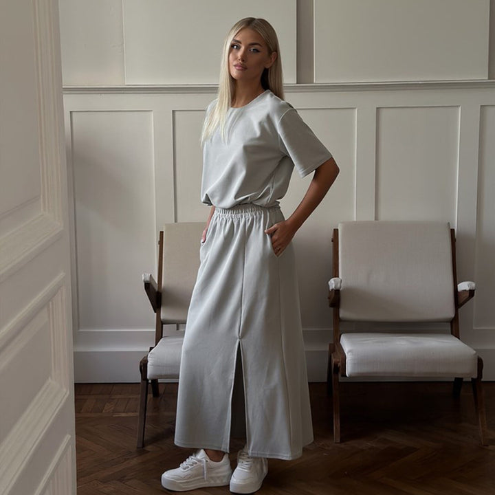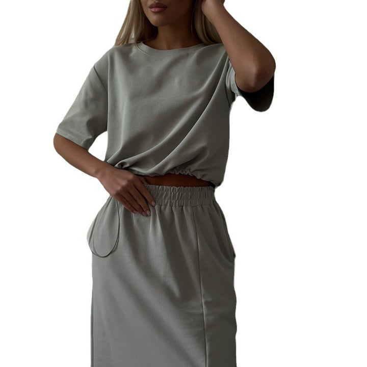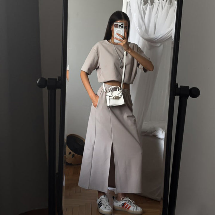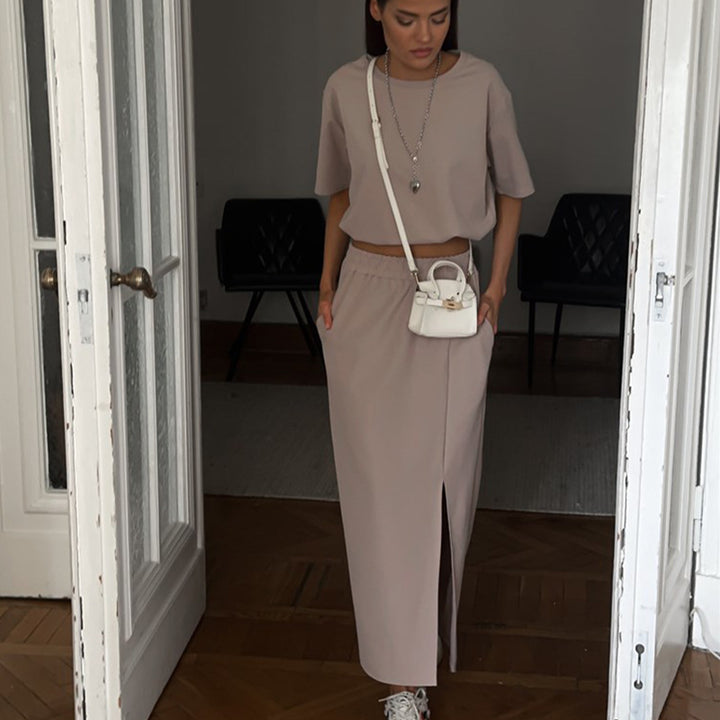 European and American summer new women's fashion skirt set solid color short-sleeved T-shirt casual pocket long skirt elegant 2-piece set