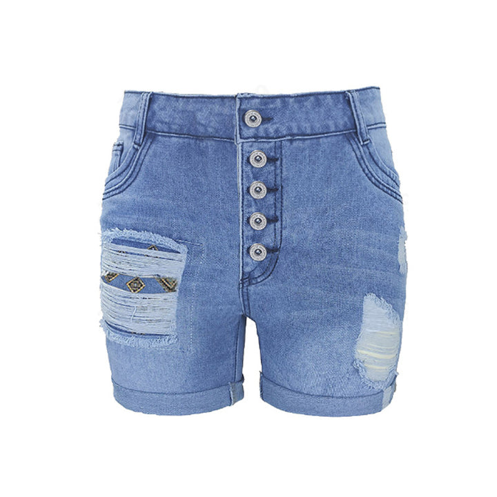 European and American supply, summer female slim single-breasted multi-buckle frayed curled denim shorts