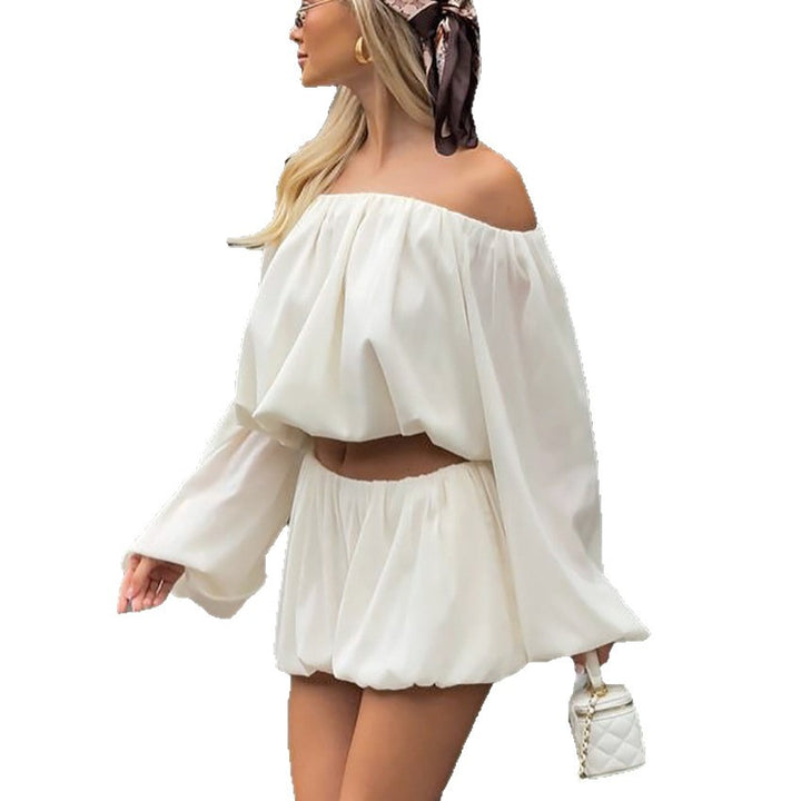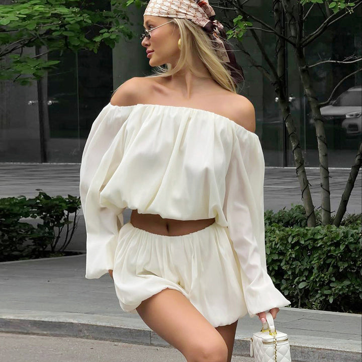 European and American versatile temperament one-word collar sexy exposed navel loose long-sleeved casual shorts street style fashion beige suit