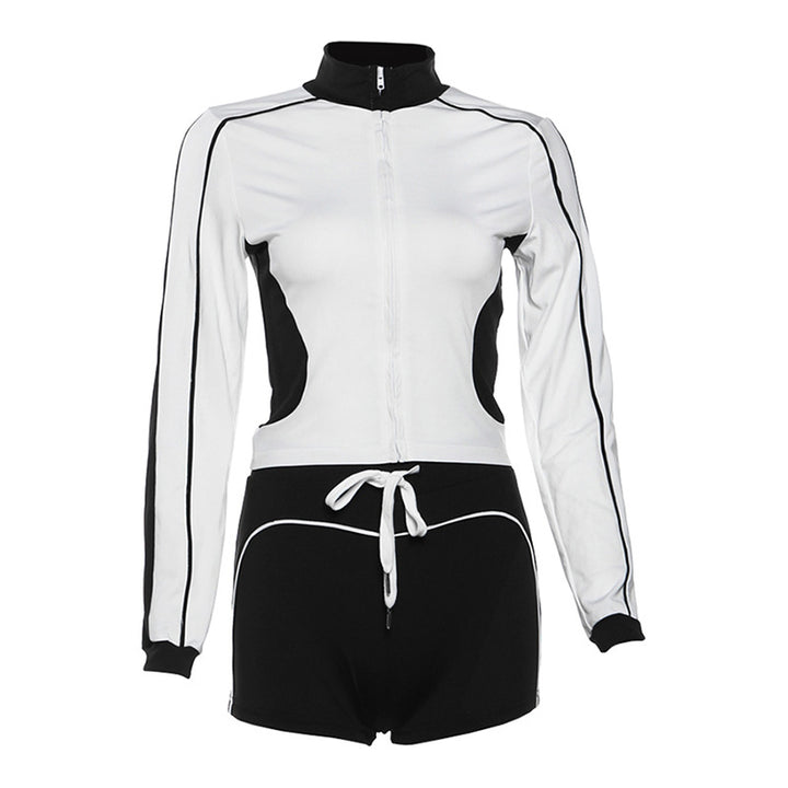 European and American women's clothing 2024 autumn and winter new fashion contrasting color splicing stand-up collar zipper slim sports casual shor...