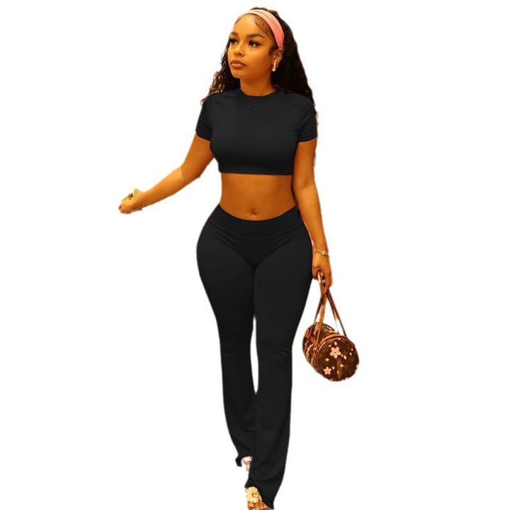 European and American women's clothing 2024 autumn hot solid color round neck short-sleeved top tight casual trousers two-piece set