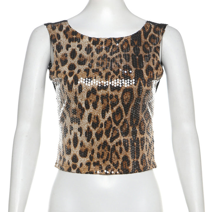 European and American women's clothing 2024 autumn new fashion sleeveless top lace splicing leopard print sequin short halter vest