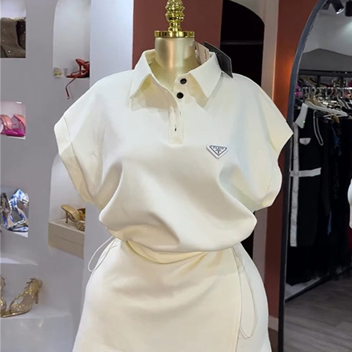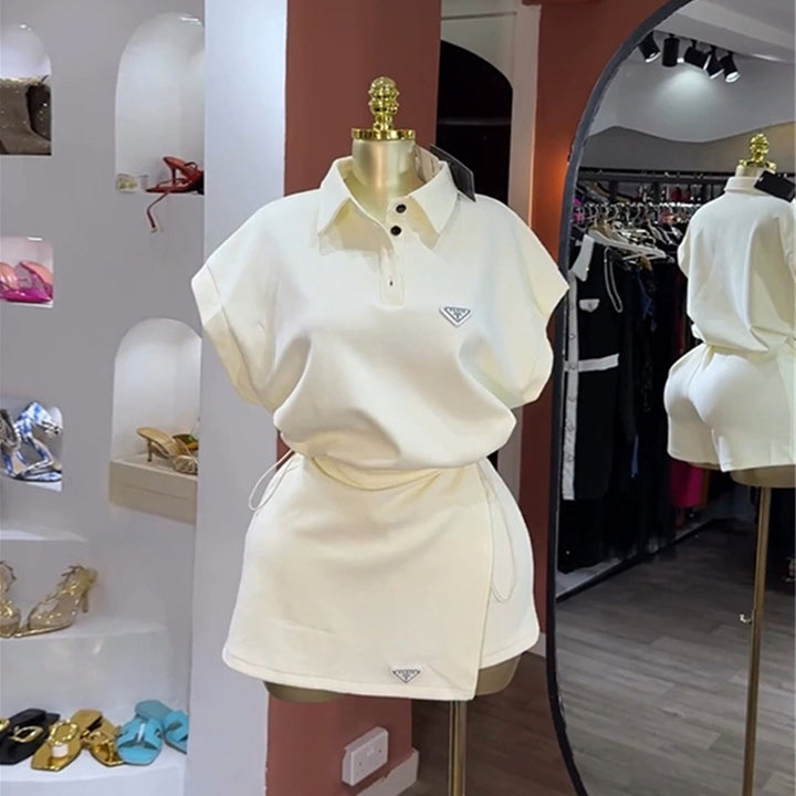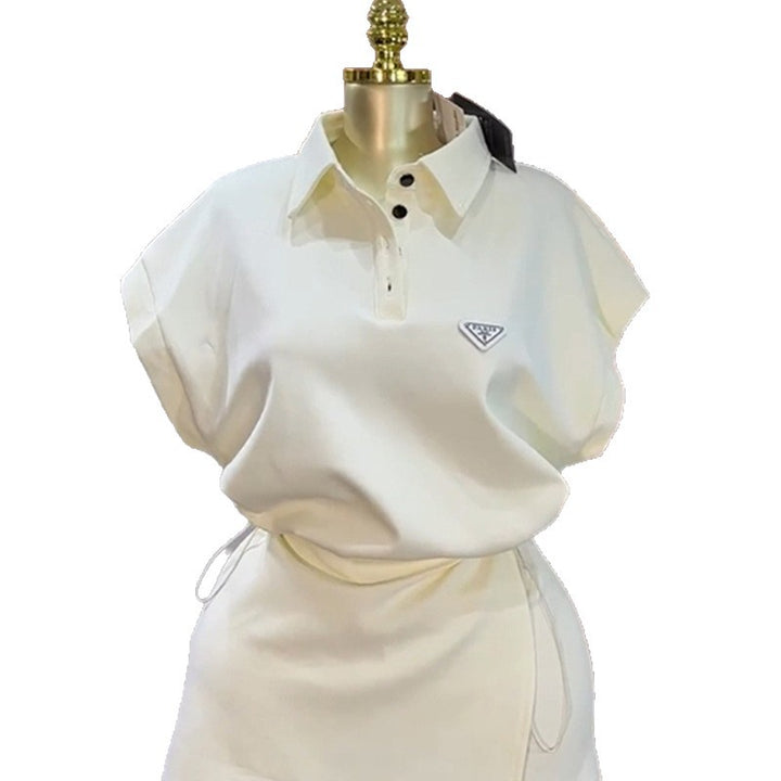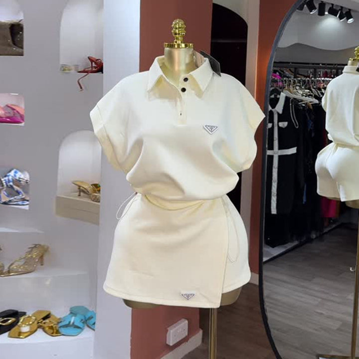European and American women's clothing 2025 autumn new casual polo collar loose short-sleeved top irregular short skirt set