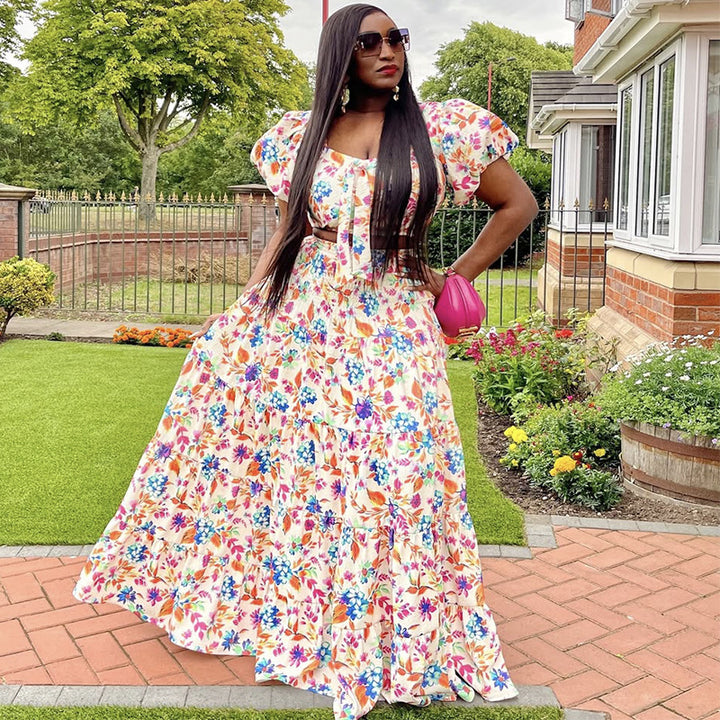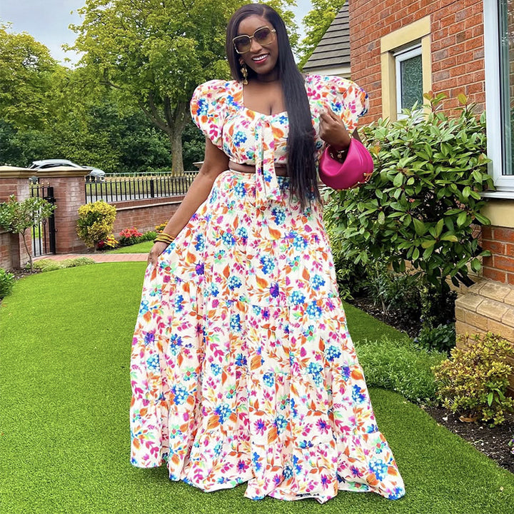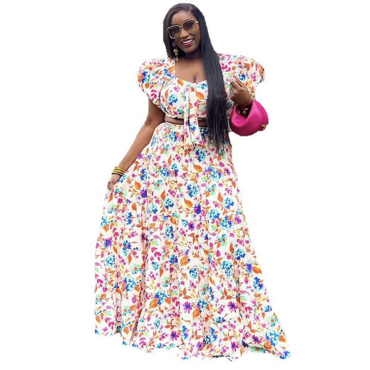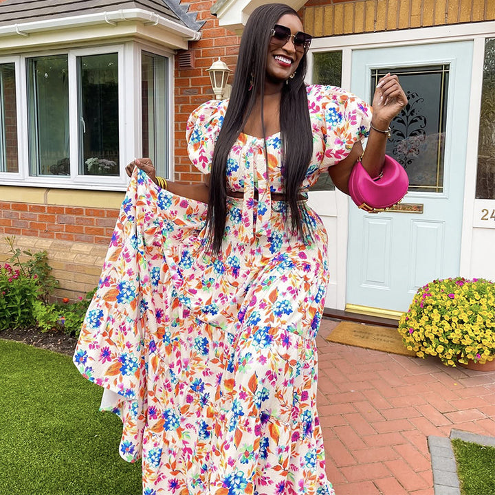 European and American women's clothing 2025 autumn new fashion streamer bubble sleeve hollow print large skirt dress