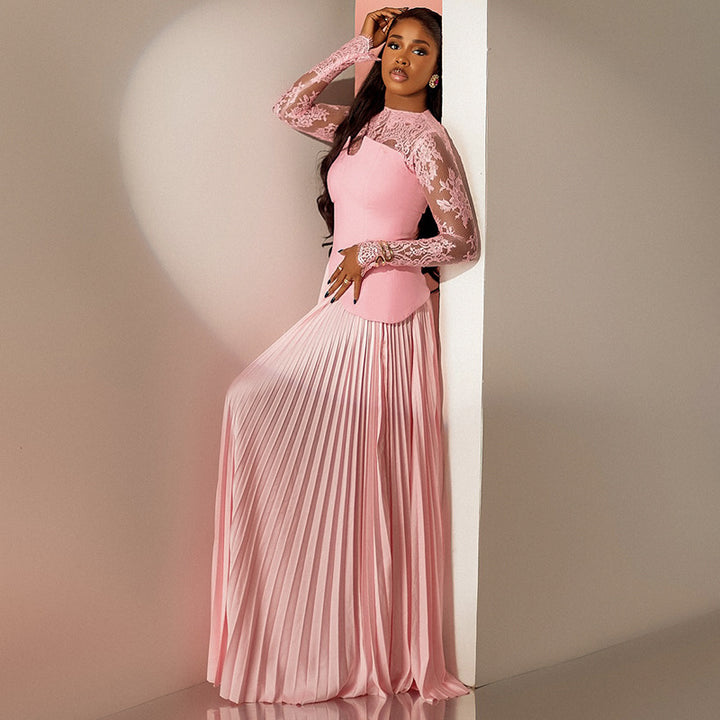 European and American women's clothing 2025 autumn new fashion temperament lace splicing chest-wrapped pleated skirt dress skirt set
