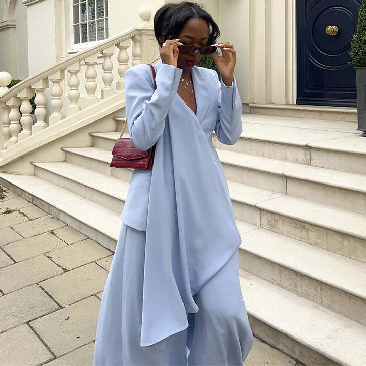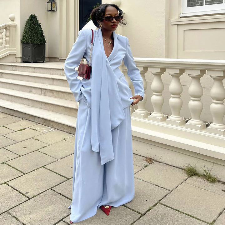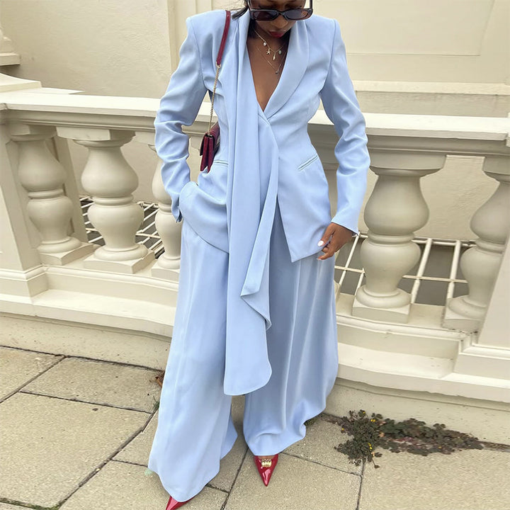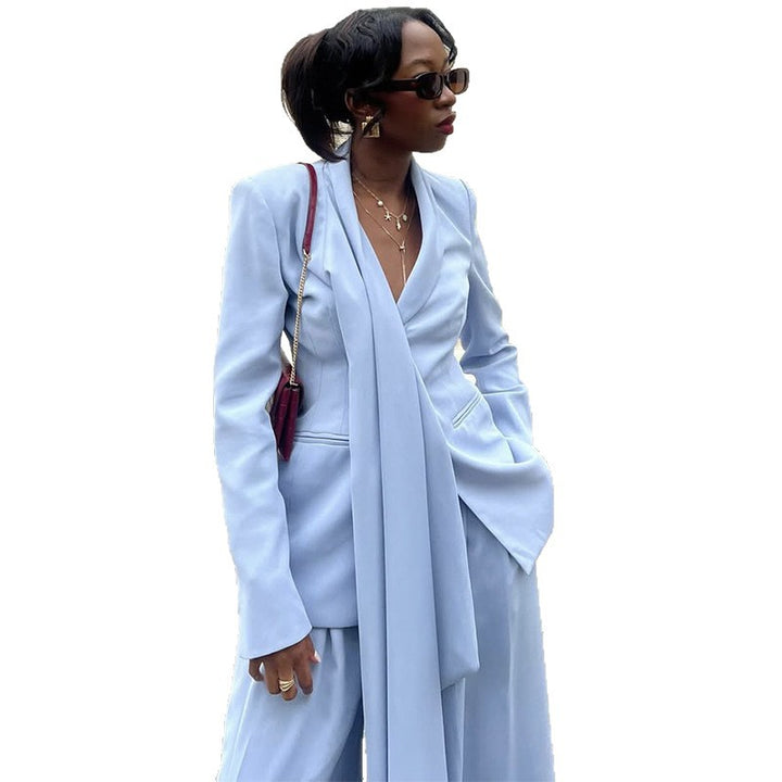European and American women's clothing 2025 autumn new fashion temperament waist thin solid color suit wide-leg pants set