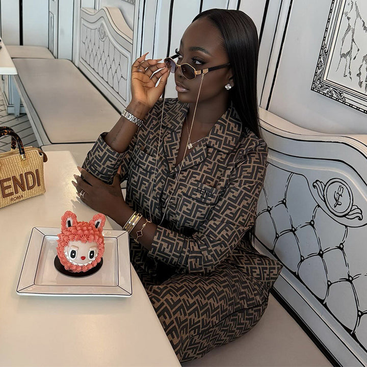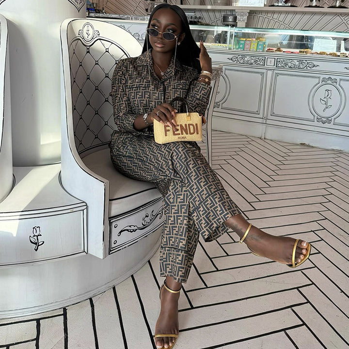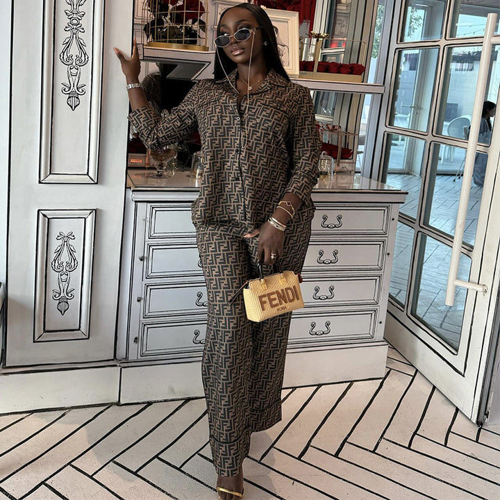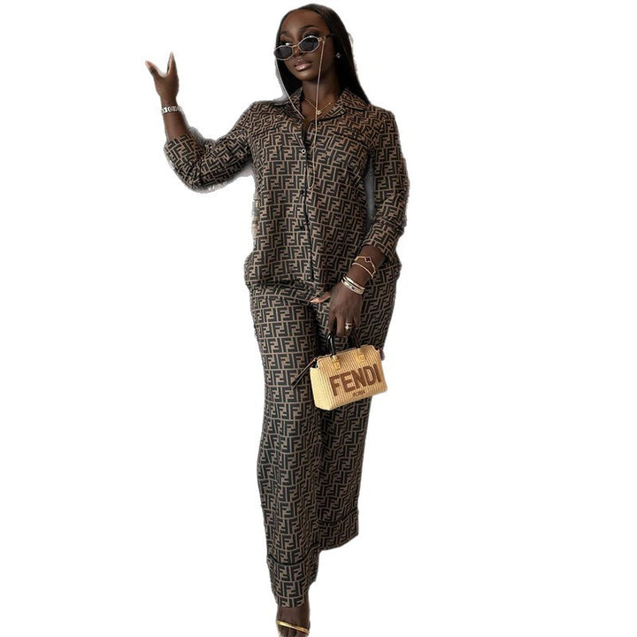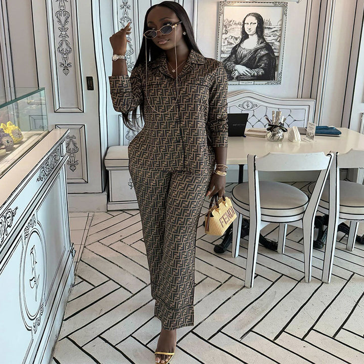 European and American women's clothing 2025 autumn new fashionable and elegant printed lapel collar seven-quarter sleeve top wide-leg pants set