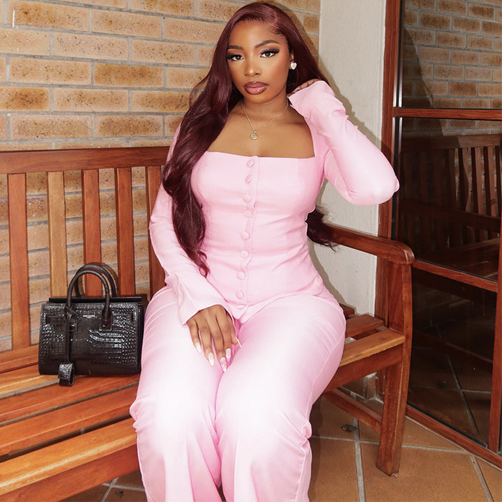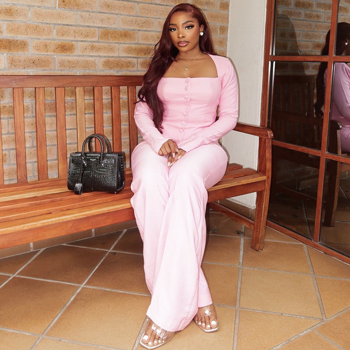 European and American women's clothing 2025 autumn new fashionable and elegant square collar button-fitting top wide-leg pants set
