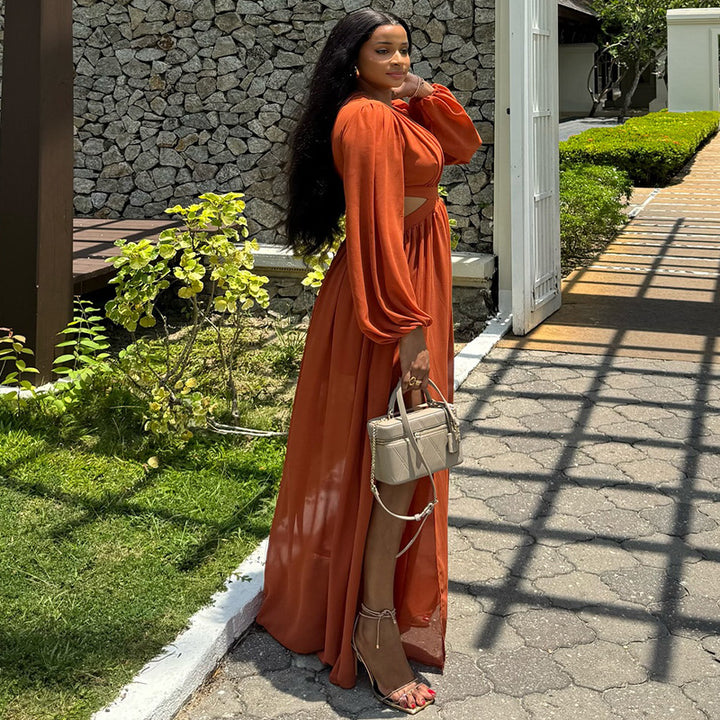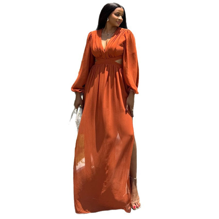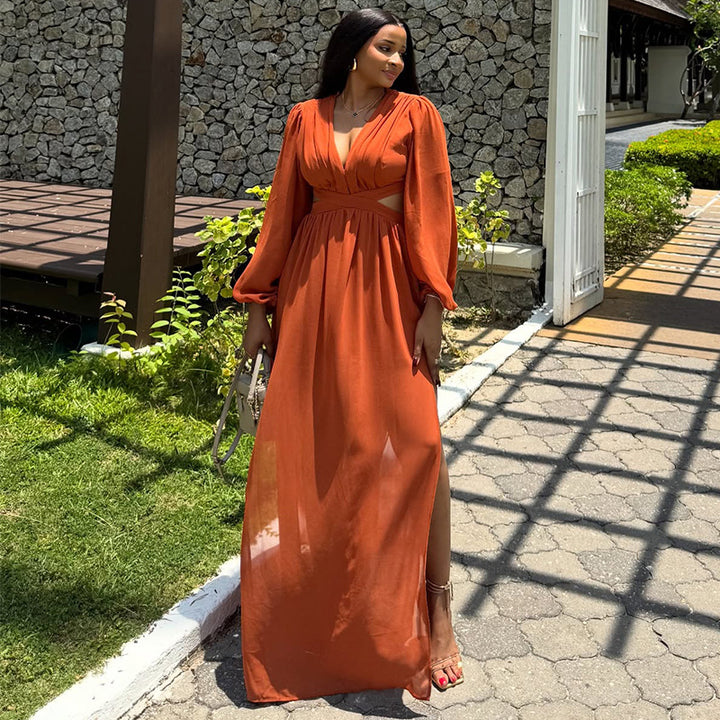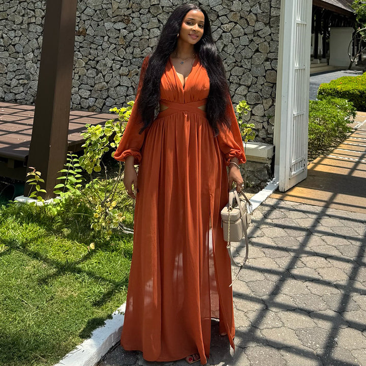 European and American women's clothing 2025 autumn new fashionable and elegant V-neck lantern sleeve hollow split-ended streamer dress