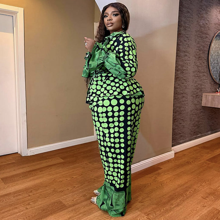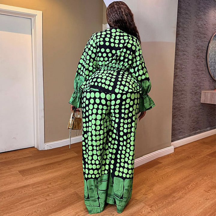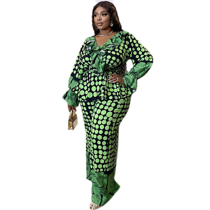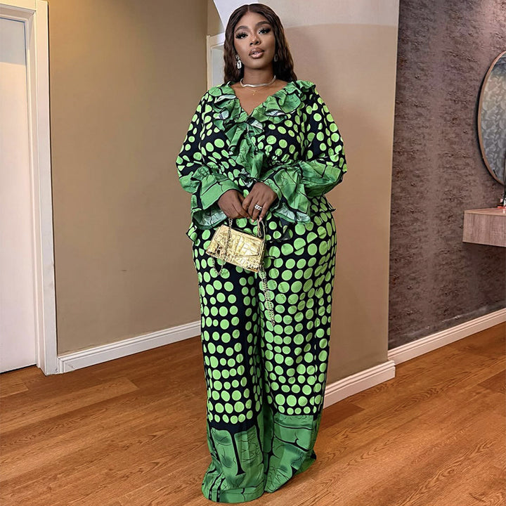 European and American women's clothing 2025 autumn new fashionable and fresh printing V-neck ruffle edge thin wide-leg pants set