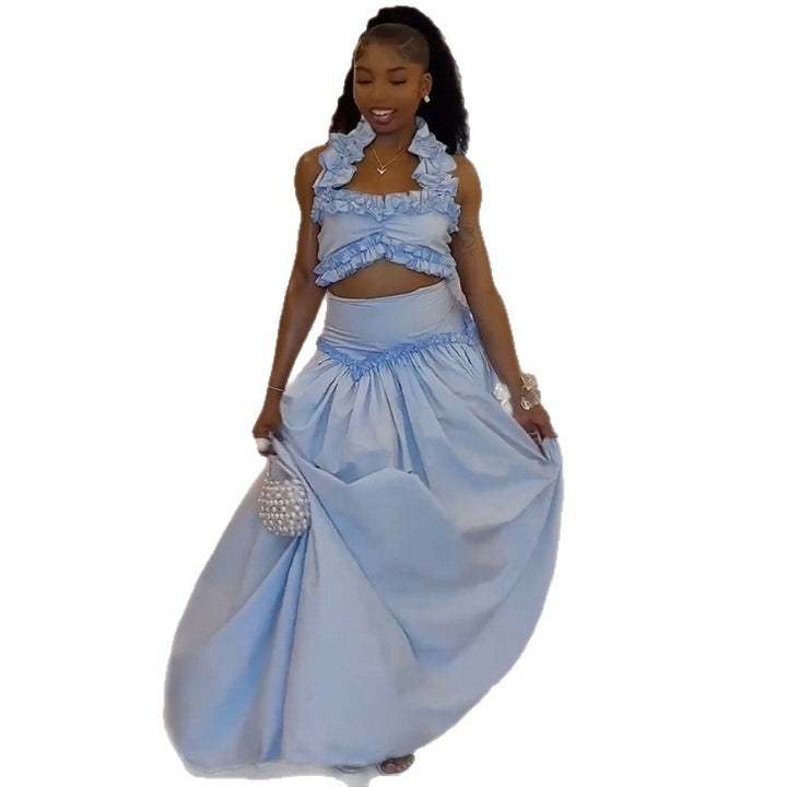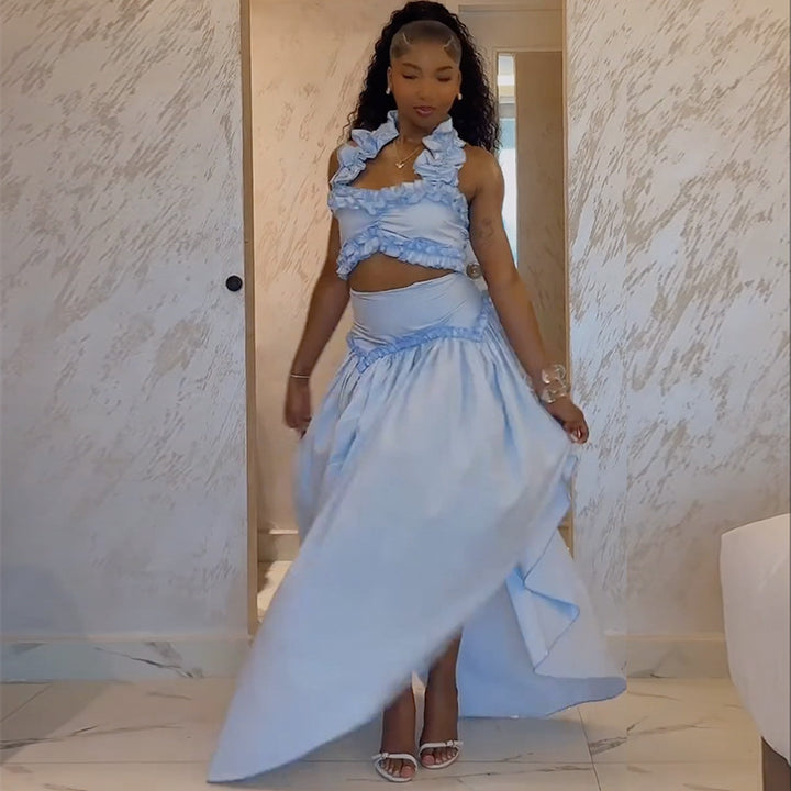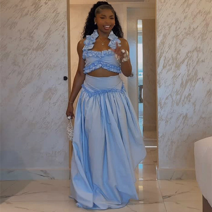 European and American women's clothing 2025 autumn new fashionable and fresh solid color ruffle edge open button top large skirt set