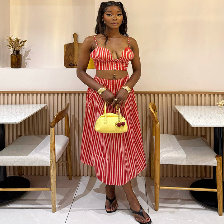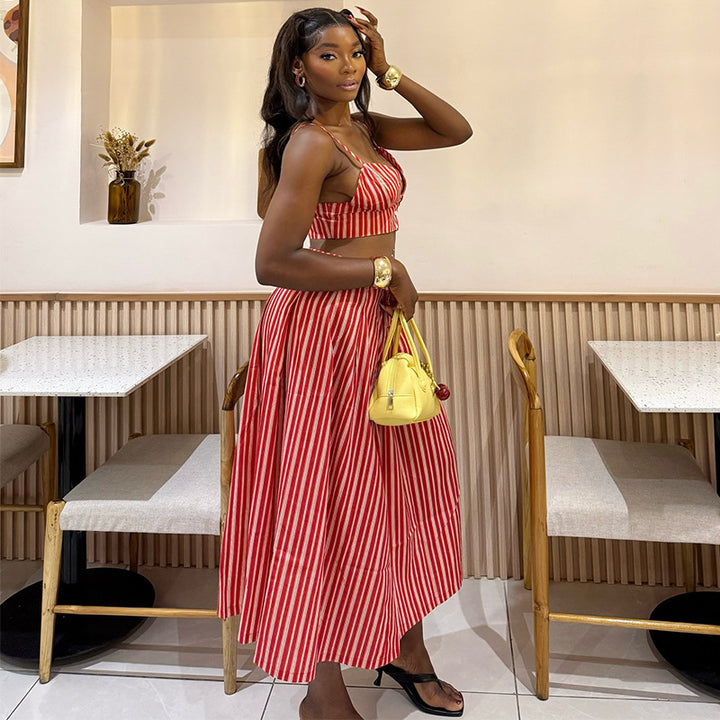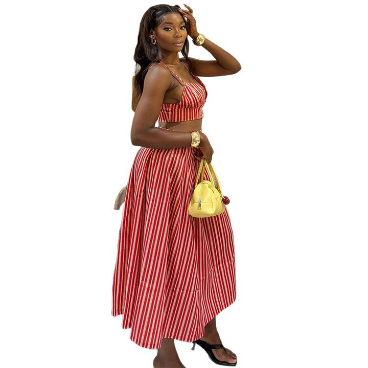 European and American women's clothing 2025 autumn new fashionable and fresh suspender vest waist striped large skirt set