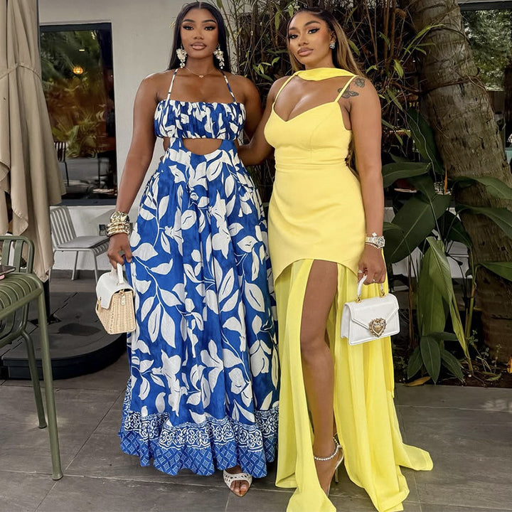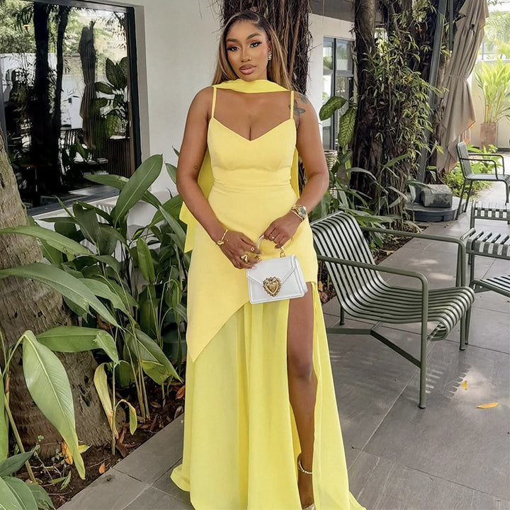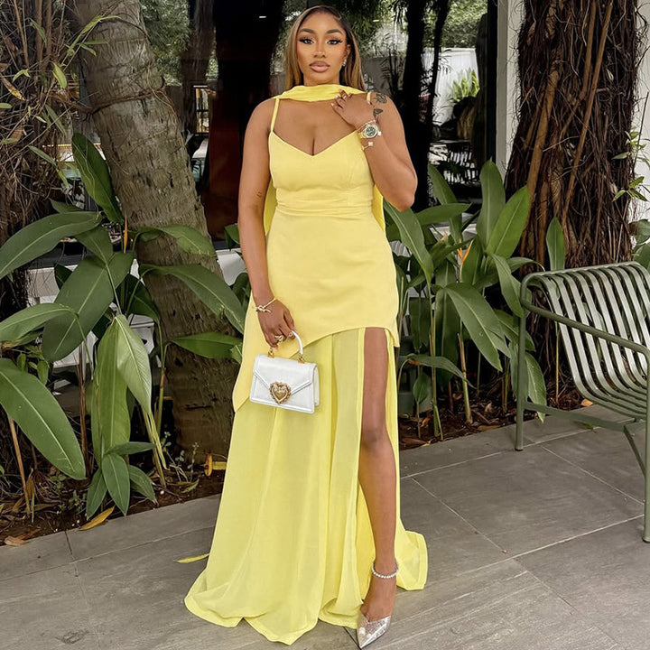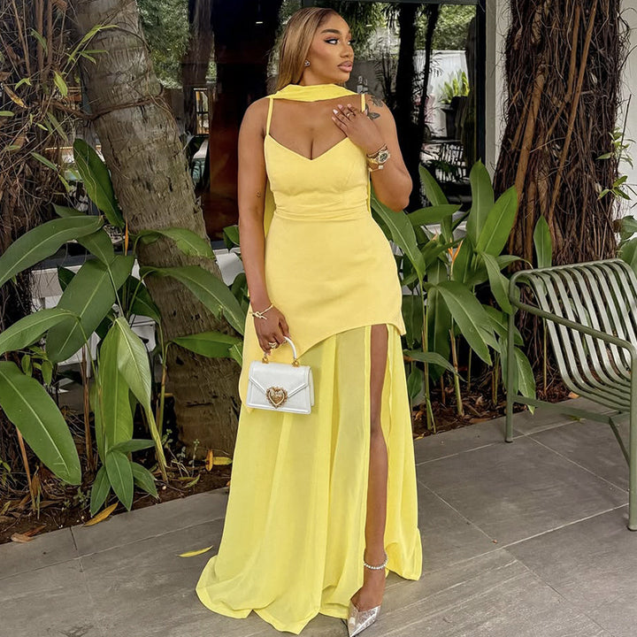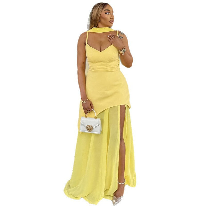 European and American women's clothing 2025 autumn new fashionable and fresh V-neck suspender high-waisted streamer split dress