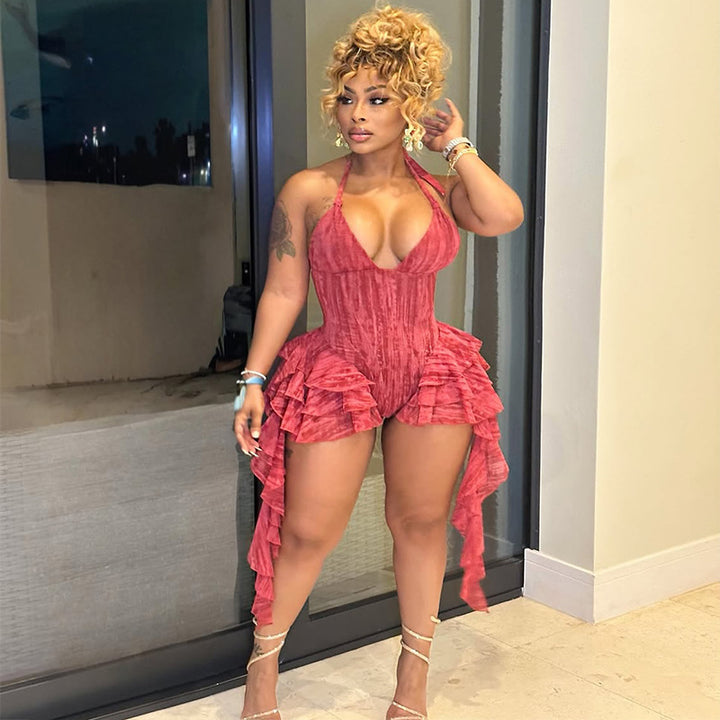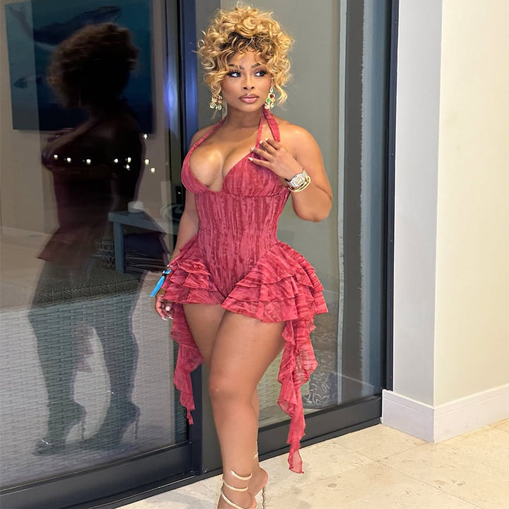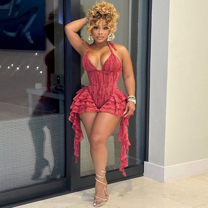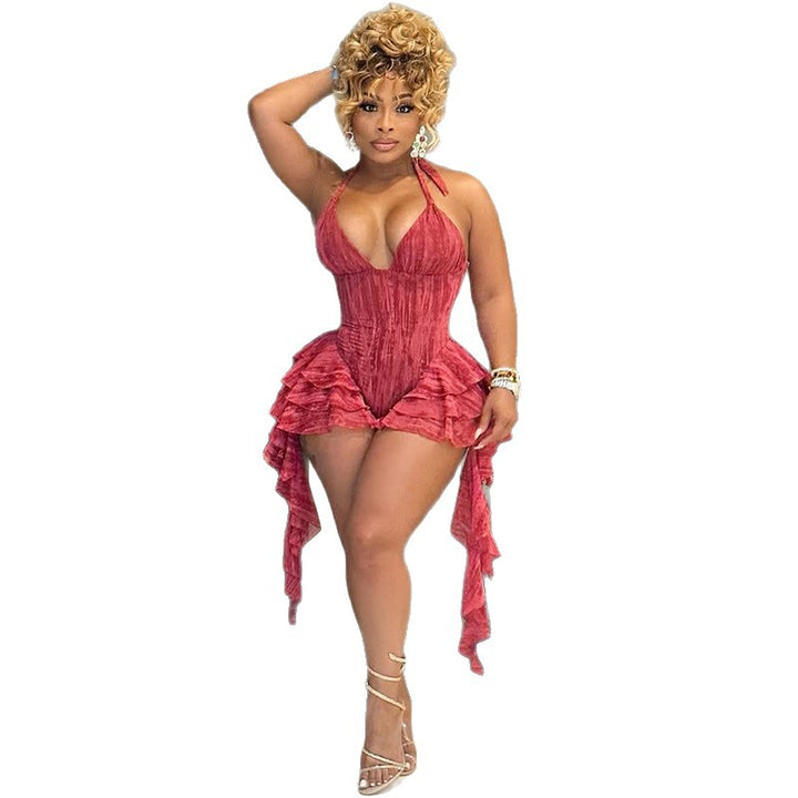 European and American women's clothing 2025 autumn new fashionable and sexy neck V-neck waist splicing streamer dress dress
